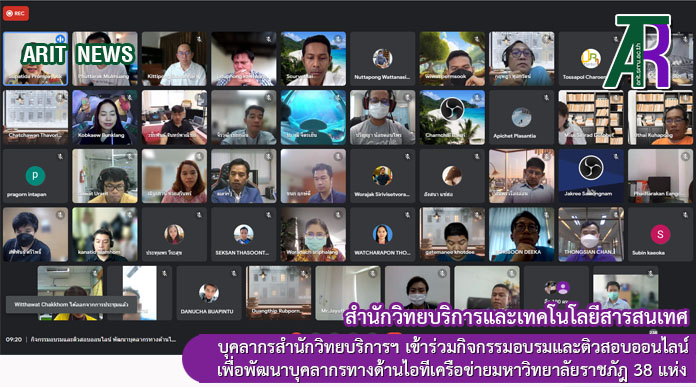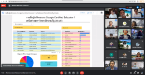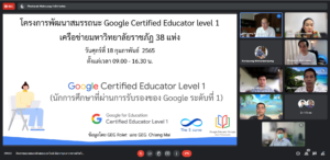 วันที่ 18 กุมภาพันธ์ 2565 เวลา 09.00 น. ผู้ช่วยศาสตราจารย์สังวาลย์ ตุกพิมาย ผู้อำนวยการสำนักวิทยบริการและเทคโนโลยีสารสนเทศ และบุคลากรงานเทคโนโลยีสารสนเทศ เข้าร่วมกิจกรรมอบรมและติวสอบออนไลน์ เพื่อพัฒนาบุคลากรทางด้านไอทีเครือข่ายมหาวิทยาลัยราชภัฎ 38 แห่ง ยกระดับสู่การเป็น Google Certified Educator ระดับ 1 ผ่านระบบออนไลน์ google meet ซึ่งจัดโดย มหาวิทยาลัยราชภัฏพิบูลสงคราม โดยมี ผู้ช่วยศาสตราจารย์ ดร.กิติพงษ์ สุวรรณราช เป็นวิทยากรให้ความรู้ในการอบรม