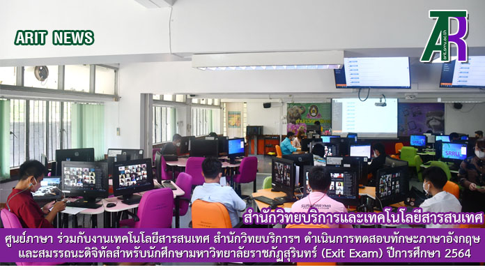 วันที่ 23 มีนาคม 2565 ศูนย์ภาษาร่วมกับงานเทคโนโลยีสารสนเทศ สำนักวิทยบริการและเทคโนโลยีสารสนเทศ ดำเนินการทดสอบทักษะภาษาอังกฤษและสมรรถนะดิจิทัลสำหรับนักศึกษามหาวิทยาลัยราชภัฏสุรินทร์ Exit Exam) ประจำปีการศึกษา 2564 ผ่านระบบจัดสอบอิเล็กทรอนิกส์ (e-Testing) และโปรแกรม WebEx โดยมีอาจารย์และบุคลากรจากทั้ง 6 คณะ จำนวน 47 คน ร่วมเป็นคณะกรรมการกำกับการสอบ ณ ห้องปฏิบัติการคอมพิวเตอร์ 28203 และ 28205 ชั้น 2 อาคาร 28 ทั้งนี้ การจัดสอบดังกล่าวมีนักศึกษาระดับปริญญาตรี ภาคปกติและภาคพิเศษ หลักสูตร 4 ปี รหัส 62 หลักสูตร 5 ปี รหัส 61 ที่มีสิทธิ์เข้ารับการทดสอบทักษะภาษาอังกฤษ จำนวน 2,541 คน และสมรรถนะดิจิทัล จำนวน 2,613 คน