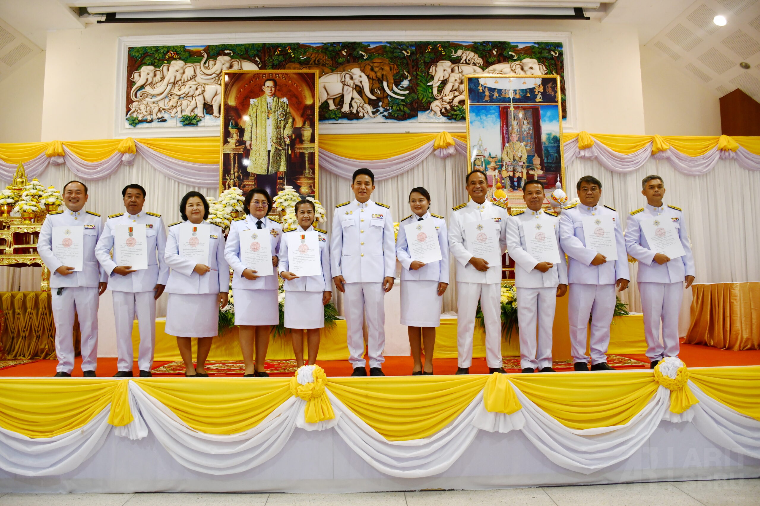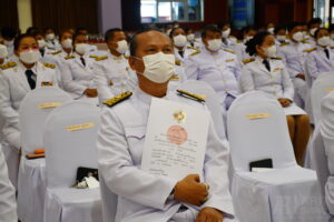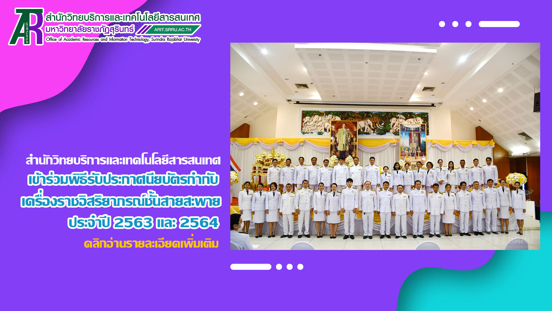 วันที่ 2 ธันวาคม 2565 เวลา 14.00 น. สำนักวิทยบริการและเทคโนโลยีสารสนเทศ มหาวิทยาลัยราชภัฏสุรินทร์ โดย ผู้ช่วยศาสตราจารย์สังวาลย์ ตุกพิมาย ผู้อำนวยการสำนักวิทยบริการฯ นำบุคลากรสำนักวิทยบริการฯ เข้าร่วมพิธีรับประกาศนียบัตรกำกับเครื่องราชอิสริยาภรณ์ชั้นสายสะพายประจำปี 2563 และ 2564 ชั้นต่ำกว่าสายสะพายประจำปี 2557 และ 2558 และเหรียญจักรพรรดิมาลาประจำปี 2558 ณ ห้องประชุมบันทายศรี ชั้น 3 คณะวิทยาการจัดการ