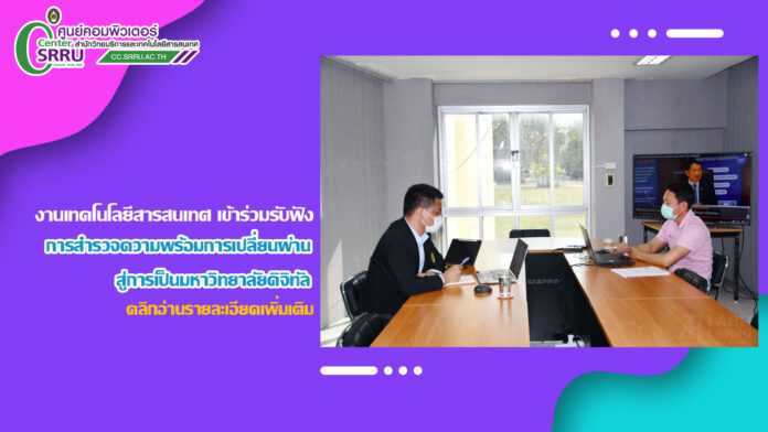 วันที่ 24 มกราคม 2566 เวลา 09.00 น. งานเทคโนโลยีสารสนเทศ สำนักวิทยบริการและเทคโนโลยีสารสนเทศ เข้าร่วมรับฟังการสำรวจความพร้อมการเปลี่ยนผ่านสู่การเป็นมหาวิทยาลัยดิจิทัล ผ่านระบบออนไลน์ โดยมี อาจารย์สุวัฒน์ กล้วยทอง รองผู้อำนวยการสำนักวิทยบริการฯ ฝ่ายเทคโนโลยีสารสนเทศ และนายโกสินทร์ มีชูสิน เจ้าหน้าที่คอมพิวเตอร์ เข้าร่วมรับฟัง
