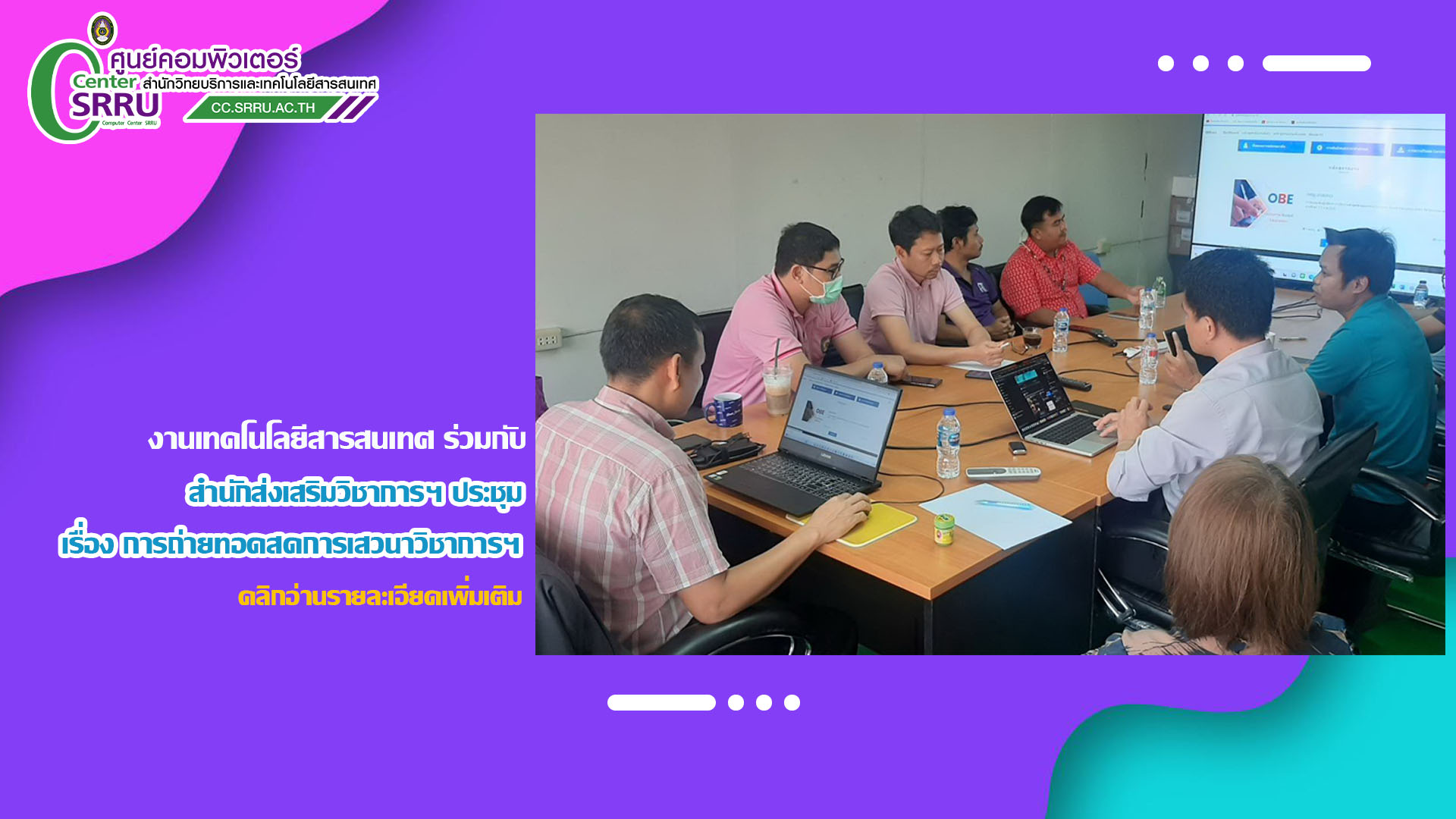 วันที่ 7 กุมภาพันธ์ 2566 เวลา 10.00 น. งานเทคโนโลยีสารสนเทศ ร่วมประชุมกับ สำนักส่งเสริมวิชาการและงานทะเบียน ในการถ่ายทอดสดการเสวนาวิชาการ เรื่อง อนาคตการศึกษาไทยกับการพลิกโฉมมหาวิทยาลัยฯ ภายใต้โครงการ SRRU Open House Open Heart 2023 ในวันที่ 14 กุมภาพันธ์ 2566 ณ โดมช้าง และห้องประชุมบันทายศรี ชั้น 3 อาคาร 44 มหาวิทยาลัยราชภัฏสุรินทร์ โดยมี อาจารย์พิทักษ์ แสนกล้า รองผู้อำนวยการสำนักส่งเสริมวิชาการและงานทะเบียน เป็นประธานการประชุม ซึ่งมี อาจารย์สุวัฒน์ กล้วยทอง รองผู้อำนวยการสำนักวิทยบริการฯ ฝ่ายเทคโนโลยีสารสนเทศ และบุคลากรสำนักวิทยบริการฯ เข้าร่วมประชุม