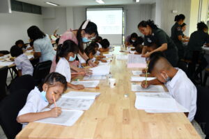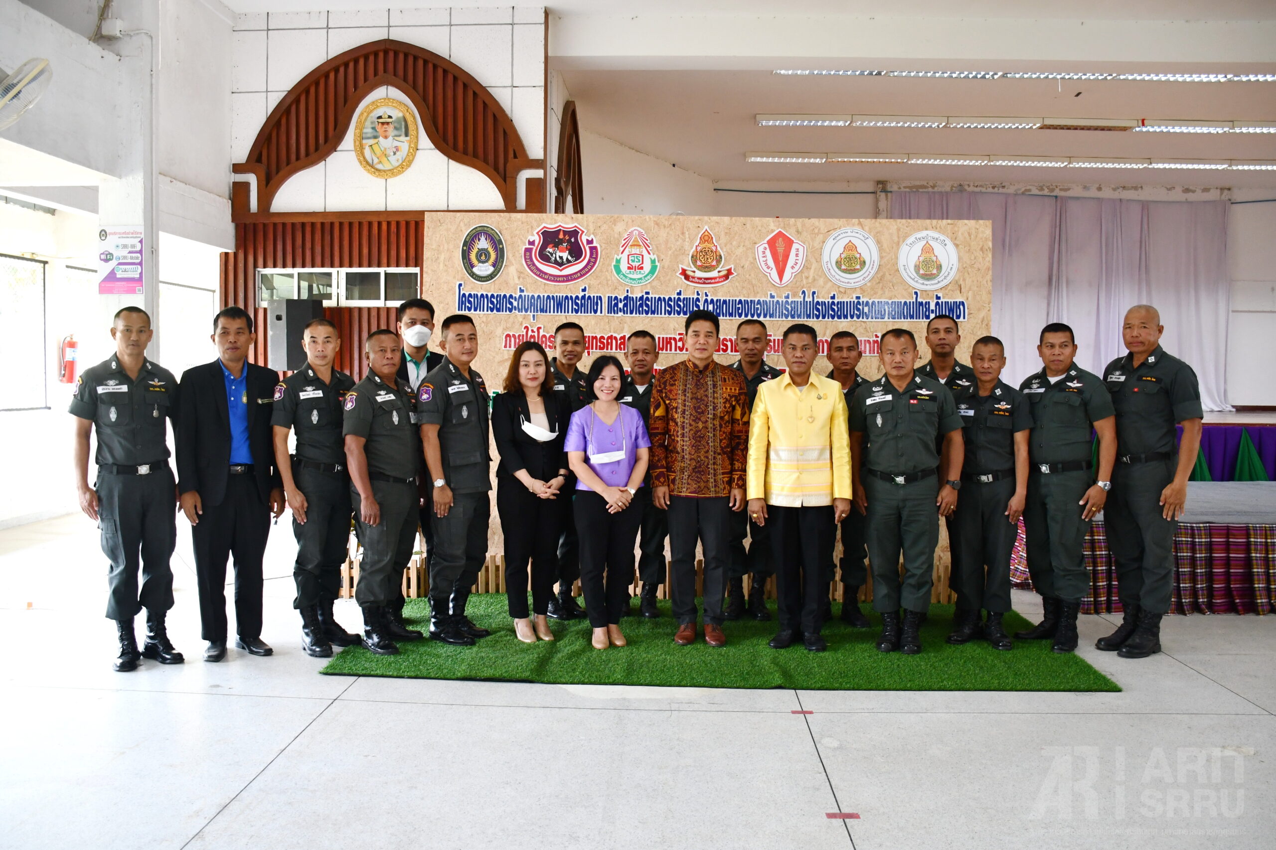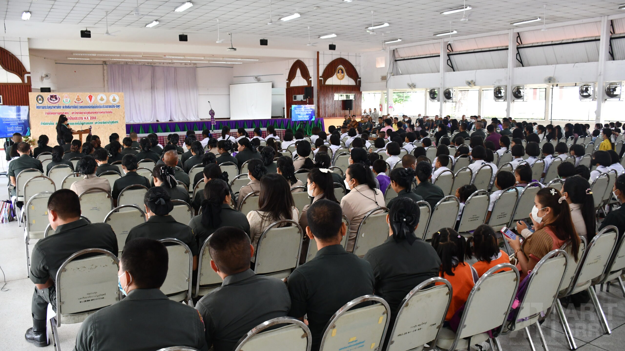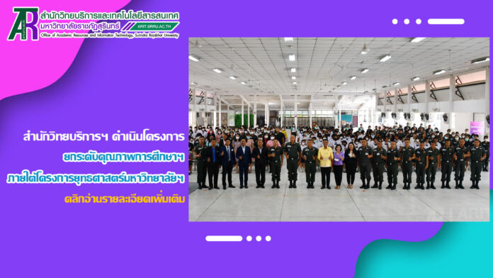วันที่ 18 มีนาคม 2566 เวลา 09.00 น. สำนักวิทยบริการและเทคโนโลยีสารสนเทศ มหาวิทยาลัยราชภัฏสุรินทร์ ดำเนินโครงการยกระดับคุณภาพการศึกษาและส่งเสริมการเรียนรู้ด้วยตนเองของนักเรียนในโรงเรียนบริเวณชายแดนไทย – กัมพูชา ภายใต้โครงการยุทธศาสตร์ มหาวิทยาลัยราชภัฏสุรินทร์เพื่อการพัฒนาท้องถิ่น ประจำปีงบประมาณ พ.ศ. 2566 ณ หอประชุมใหญ่ มหาวิทยาลัยราชภัฏสุรินทร์ โดยมี ผู้ช่วยศาสตราจารย์ ดร.ฉลอง สุขทอง อธิการบดีมหาวิทยาลัยราชภัฏสุรินทร์ เป็นประธานในการเปิดโครงการ ทั้งนี้ ผู้ช่วยศาสตราจารย์สังวาลย์ ตุกพิมาย ผู้อำนวยการสำนักวิทยบริการฯ ได้กล่าวรายงานความเป็นมา และวัตถุประสงค์การดำเนินของโครงการฯ ซึ่งการดำเนินโครงการฯ ในครั้งนี้ เป็นการดำเนินโครงการในกิจกรรมที่ 1 ค่ายวิชาการ จัดระหว่างวันที่ 18 – 19 มีนาคม 2566 โดยแบ่งเป็น 5 กิจกรรม ดังนี้ 1. การอบรมเชิงปฏิบัติการวาดภาพ 2. การอบรมเชิงปฏิบัติการคัดลายมือ 3. การอบรมเชิงปฏิบัติการเขียนเรียงความ 4. การอบรมเชิงปฏิบัติการ่านเอาเรื่อง 5. การอบรมเชิงปฏิบัติการกล่าวสุนทรพจน์ ในกิจกรรมดังกล่าวได้รับความสนใจจากนักเรียน และครูในกลุ่มเป้าหมายเข้าร่วมอบรมเป็นจำนวนมาก