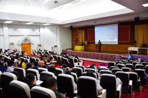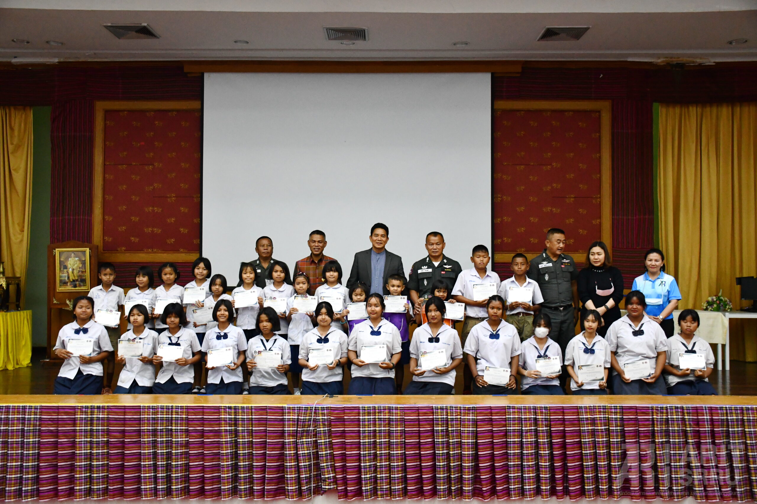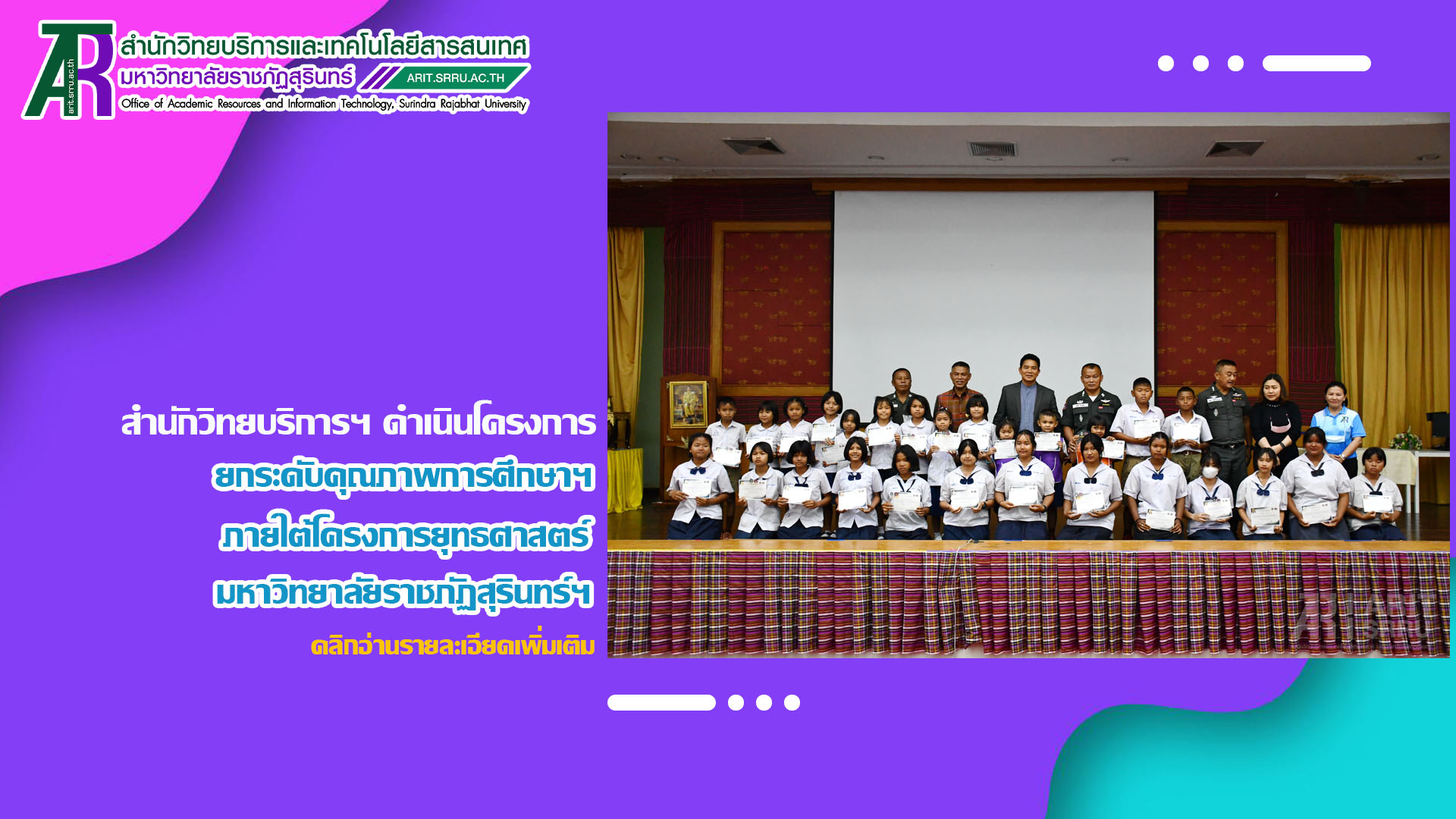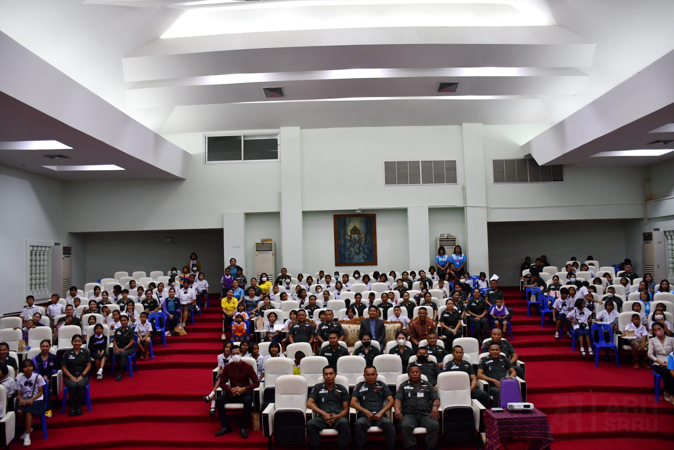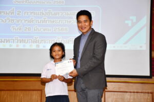 วันที่ 28 มีนาคม 2566 08.30 น. สำนักวิทยบริการและเทคโนโลยีสารสนเทศ มหาวิทยาลัยราชภัฏสุรินทร์ ดำเนินโครงการยกระดับคุณภาพการศึกษาและส่งเสริมการเรียนรู้ด้วยตนเองของนักเรียนในโรงเรียนบริเวณชายแดนไทย – กัมพูชา ภายใต้โครงการยุทธศาสตร์ มหาวิทยาลัยราชภัฏสุรินทร์เพื่อการพัฒนาท้องถิ่น ประจำปีงบประมาณ พ.ศ. 2566 ในกิจกรรมที่ 2 การแข่งขันความสามารถทางวิชาการด้านทักษะภาษาไทย ณ ห้องเธียร์เตอร์ ชั้น 2 อาคาร 38 โดยมีนักเรียนโรงเรียนตำรวจตระเวนชายแดน จำนวน 9 แห่ง ส่งนักเรียนเข้าร่วมการแข่งขัน และในเวลา 14.00 น. ผู้ช่วยศาสตราจารย์ ดร.ฉลอง สุขทอง อธิการบดีมหาวิทยาลัยราชภัฏสุรินทร์ เป็นประธานในการปิดโครงการ และมอบเกียรติบัตรให้แก่นักเรียนที่ชนะการแข่งขันอันดับที่ 1 – 3 ทั้งนี้ ผู้ช่วยศาสตราจารย์สังวาลย์ ตุกพิมาย ผู้อำนวยการสำนักวิทยบริการฯ ได้รายงานสรุปการดำเนินของโครงการฯ ให้แก่ท่านประธานได้รับทราบ