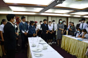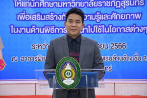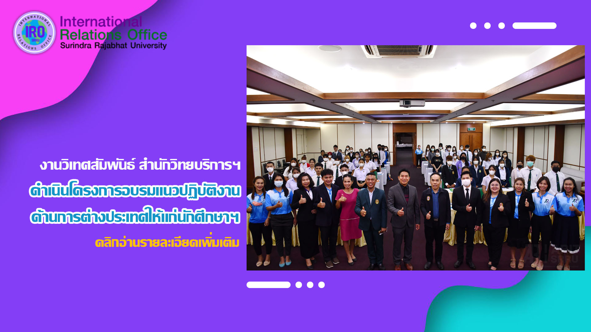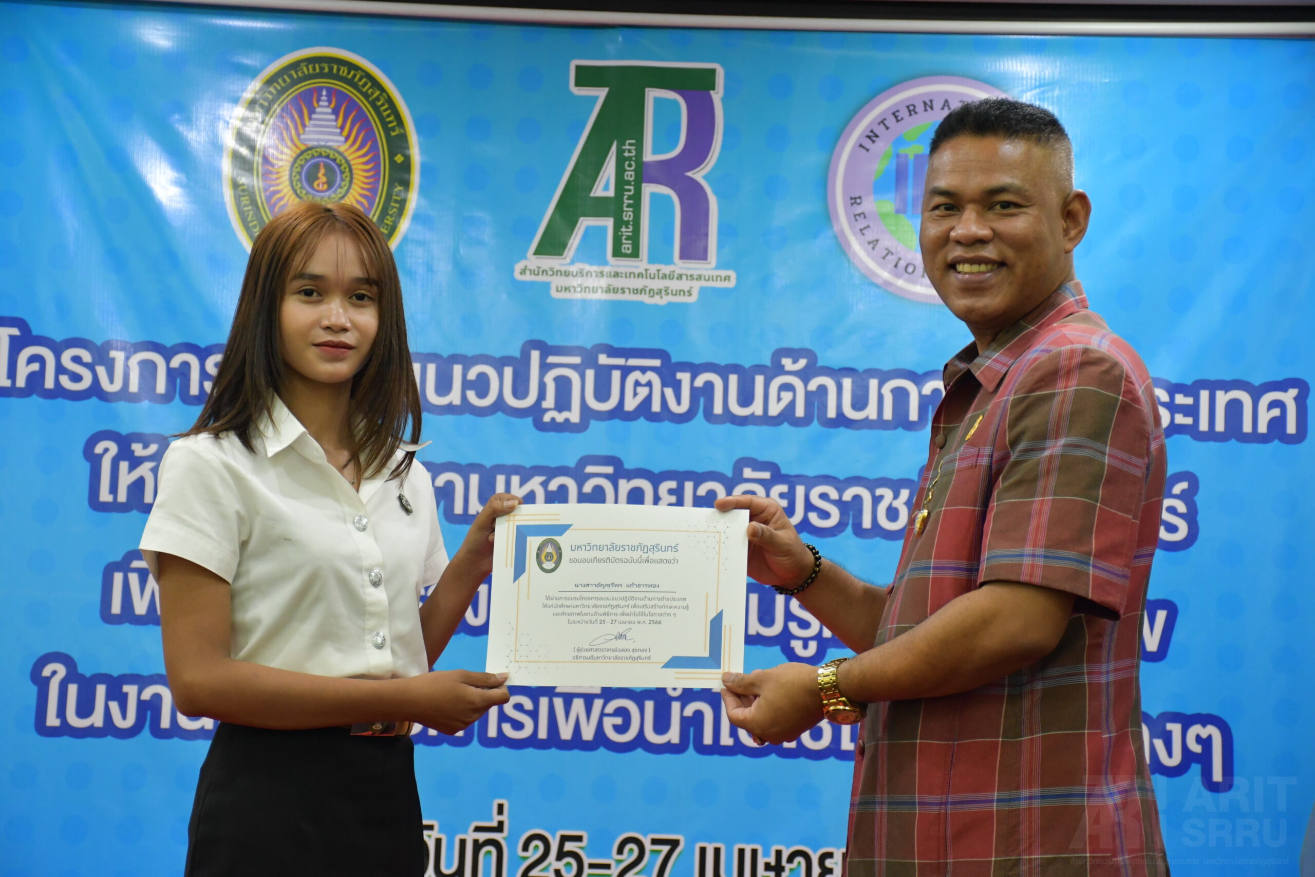 วันที่ 26 เมษายน 2566 งานวิเทศสัมพันธ์ สำนักวิทยบริการและเทคโนโลยีสารสนเทศ มหาวิทยาลัยราชภัฏสุรินทร์ ดำเนินโครงการอบรมแนวปฏิบัติงานด้านการต่างประเทศให้แก่นักศึกษามหาวิทยาลัยราชภัฏสุรินทร์ เพื่อเสริมสร้างทักษะความรู้ และศักยภาพในงานด้านพิธีการเพื่อนำไปใช้ในโอกาสต่าง ๆ ณ ห้องประชุมล้านช้าง ชั้น 2 อาคารฝึกประสบการณ์วิชาชีพล้านช้าง โดยมี ผู้ช่วยศาสตราจารย์ ดร.ฉลอง สุขทอง อธิการบดีมหาวิทยาลัยราชภัฏสุรินทร์ เป็นประธานการเปิดโครงการฯ ซึ่งจัดขึ้นระหว่างวันที่ 26 – 27 เมษายน 2566 ในการนี้ ได้รับเกียรติจาก ผู้ช่วยศาสตราจารย์ ดร.อาสนะ เชิดชู ผู้อำนวยการสถาบันภาษาศิลปะและวัฒนธรรม มหาวิทยาลัยราชภัฏศรีสะเกษ และนายธวัช สารกอง ผู้จัดการแผนกอาหารและเครื่องดื่ม โรงแรมโมเดน่า บายเฟรเซอร์ บุรีรัมย์ มาเป็นวิทยากรให้ความรู้ในเรื่องมารยาทบนโต๊ะอาหารงานด้านการต่างประเทศ การแต่งกายงานด้านการต่างประเทศ งานพิธีการและการรับรอง และทักษะการสื่อสารงานด้านการต่างประเทศ ในวันที่ 27 เมษายน 2566 เวลา 15.00 น. ผู้ช่วยศาสตราจารย์สังวาลย์ ตุกพิมาย ผู้อำนวยการสำนักวิทยบริการฯ ได้มอบเกียรติบัตรให้แก่ผู้เข้าร่วมการอบรม และกล่าวปิดโครงการอบรมแนวปฏิบัติงานด้านการต่างประเทศให้แก่นักศึกษามหาวิทยาลัยราชภัฏสุรินทร์ฯ
