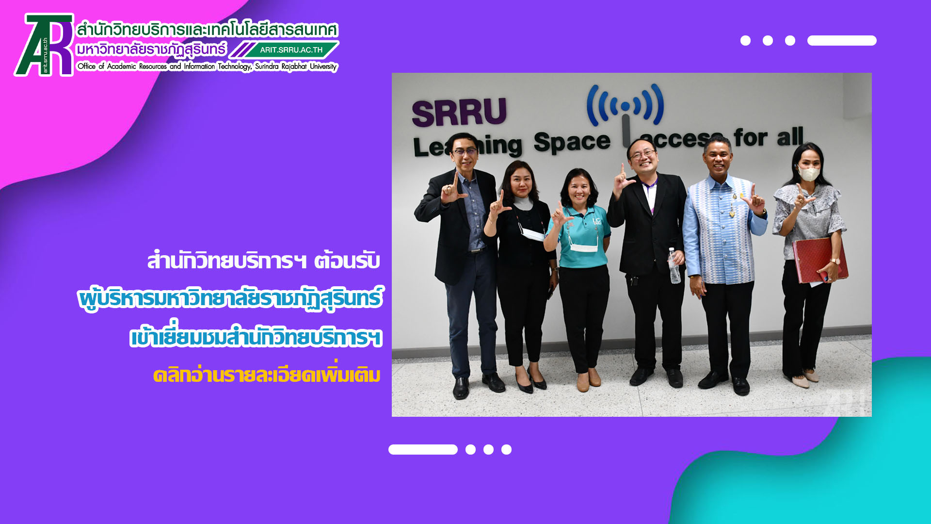 วันที่ 26 กรกฎาคม 2566 เวลา 13.30 น. สำนักวิทยบริการและเทคโนโลยีสารสนเทศ นำโดย ผู้ช่วยศาสตราจารย์สังวาลย์ ตุกพิมาย ผู้อำนวยการสำนักวิทยบริการฯ และผู้บริหารสำนักวิทยบริการฯ ให้การต้อนรับ ผู้ช่วยศาสตราจารย์ ดร.อำนวย วัฒนกรสิริ รองอธิการบดีฝ่ายเทคโนโลยีและการสื่อสารองค์กร และผู้ช่วยศาสตราจารย์ ดร.อภิชาติ แสงอัมพร รองอธิการบดีฝ่ายยุทธศาสตร์แผนและการพัฒนาระบบการบริหารจัดการ ในการเข้าเยี่ยมชมสำนักวิทยบริการฯ