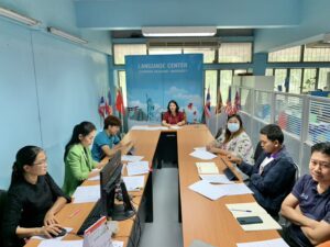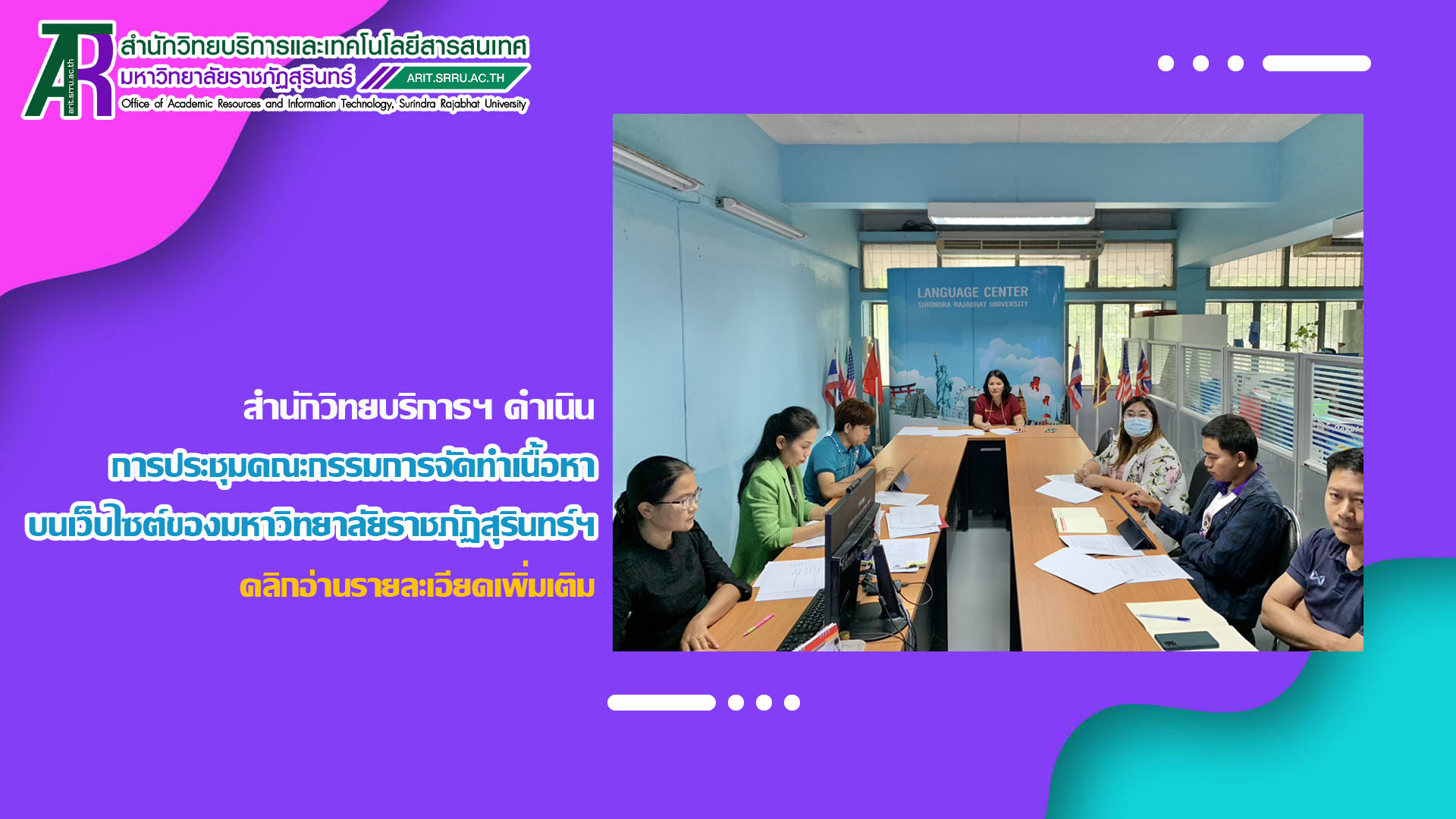 วันที่ 3 สิงหาคม 2566 เวลา 13.30 น. ผู้ช่วยศาสตราจารย์ ดร.นิศานาถ แก้ววินัด รองผู้อำนวยการสำนักวิทยบริการฯ ฝ่ายภาษา เป็นประธานการประชุมคณะกรรมการจัดทำเนื้อหาบนเว็บไซต์ของมหาวิทยาลัยราชภัฏสุรินทร์ในรูปแบบภาษาต่างประเทศ (ภาษาอังกฤษ) ครั้งที่ 3/2566 ณ ห้อง 28203 ชั้น 2 อาคาร 28 โดยมีคณะกรรมการฯ เข้าร่วมประชุมเพื่อติดตามการจัดทำเนื้อหาเพื่อเผยแพร่บนเว็บไซต์ของมหาวิทยาลัยราชภัฏสุรินทร์