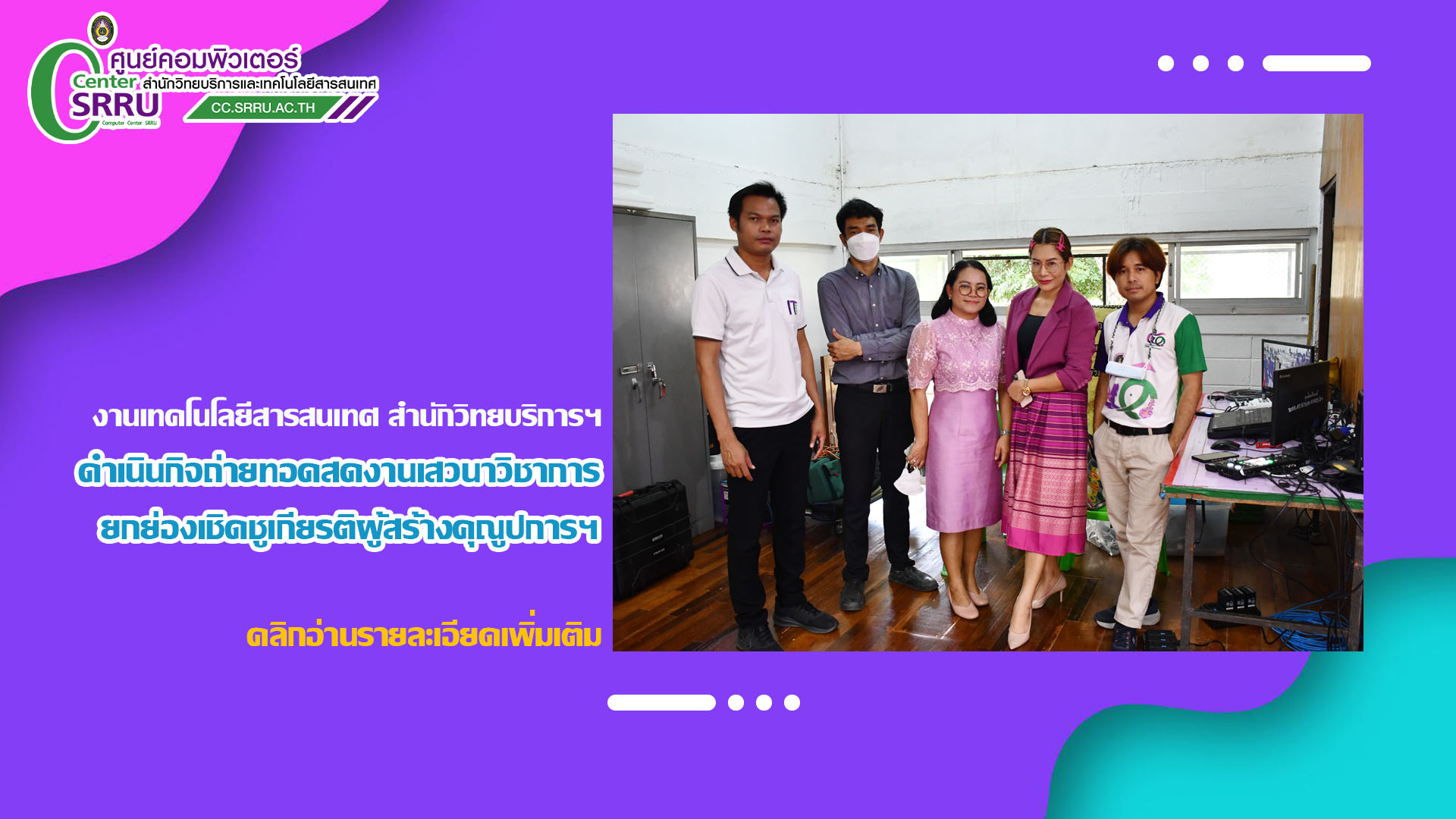วันที่ 29 กันยายน 2566 เวลา 08.30 น. งานเทคโนโลยีสารสนเทศ สำนักวิทยบริการและเทคโนโลยีสารสนเทศ ดำเนินการถ่ายทอดสดร่วมงานเสวนาวิชาการยกย่องเชิดชูเกียรติผู้สร้างคุณูปการแก่มหาวิทยาลัยราชภัฏสุรินทร์ “มุทิตา อาเศียรวาท” ปี 2566 ณ หอประชุม มหาวิทยาลัยราชภัฏสุรินทร์