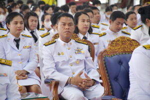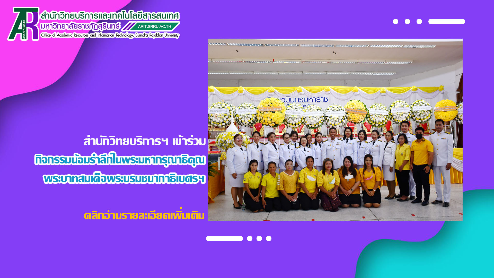 วันที่ 11 ตุลาคม 2566 เวลา 08.30 น. สำนักวิทยบริการและเทคโนโลยีสารสนเทศ เข้าร่วมกิจกรรมน้อมรำลึกในพระมหากรุณาธิคุณพระบาทสมเด็จพระบรมชนากาธิเบศร มหาภูมิพลอดุลยเดชมหาราช บรมนาถบพิตร เนื่องในวันนวมินทรมหาราช 13 ตุลาคม 2566 ในการนี้ ผู้ช่วยศาสตราจารย์สังวาลย์ ตุกพิมาย ผู้อำนวยการสำนักวิทยบริการฯ นำบุคลากรสำนักวิทยบริการฯ เข้าร่วมกิจกรรม โดยมีพิธีบำเพ็ญกุศลถวายเป็นพระราชกุศล และพิธีวางพวงมาลาจากผู้บริหารในระดับคณะ สำนัก สถาบัน ณ หอประชุมใหญ่ มหาวิทยาลัยราชภัฏสุรินทร์