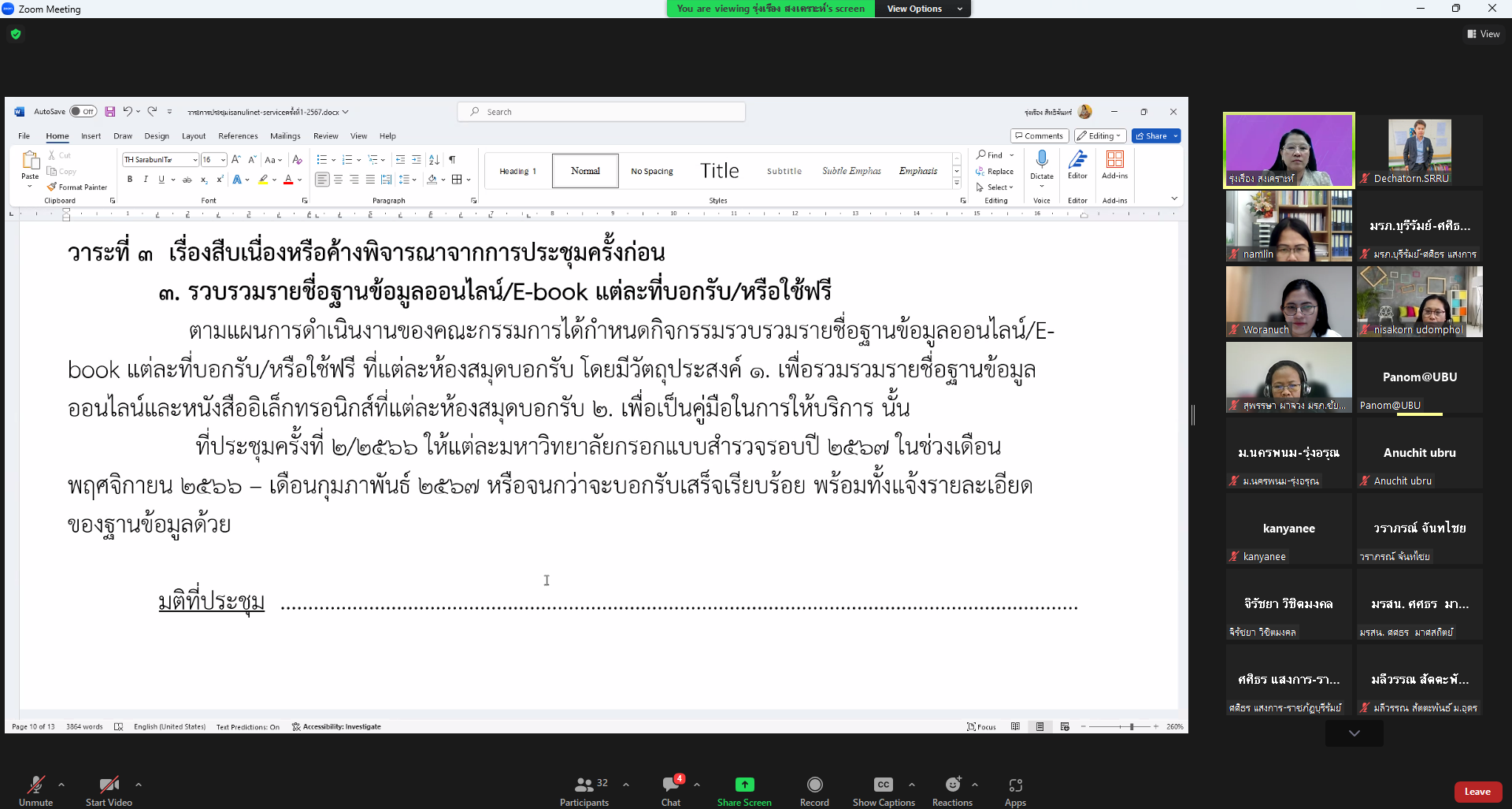 วันที่ 18 มกราคม 2567 เวลา 09.00 น. งานวิทยบริการ สำนักวิทยบริการและเทคโนโลยีสารสนเทศ เข้าร่วมประชุมและแลกเปลี่ยนการเรียนรู้คณะกรรมการฝ่ายบริการ ข่ายงานห้องสมุดสถาบันอุดมศึกษาในภาคตะวันออกเฉียงเหนือ (ISANULINET) ครั้งที่ 1/2567 แบบออนไลน์ผ่านโปรแกรม Zoom ในการนี้ ได้มีคณะกรรมการฯ เข้าร่วมประชุม เพื่อพิจารณาตามวาระ และแลกเปลี่ยนเรียนรู้ในงานบริการห้องสมุด เพื่อนำไปประยุกต์ในการให้บริการห้องสมุดของแต่ละมหาวิทยาลัยฯ