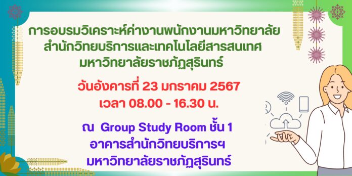 สำนักวิทยบริการและเทคโนโลยีสารสนเทศ จะดำเนินการอบรมวิเคราะห์ค่างานพนักงานมหาวิทยาลัย สำนักวิทยบริการฯ ในวันที่ 23 มกราคม 2567 เวลา 08.00 – 16.30 น. ณ ห้อง Group Study Room ชั้น 1 อาคารสำนักวิทยบริการฯ ในการนี้ ขอให้พนักงานมหาวิทยาลัย (งบประมาณแผ่นดิน) เข้าร่วมอบรมตามวันเวลาดังกล่าว