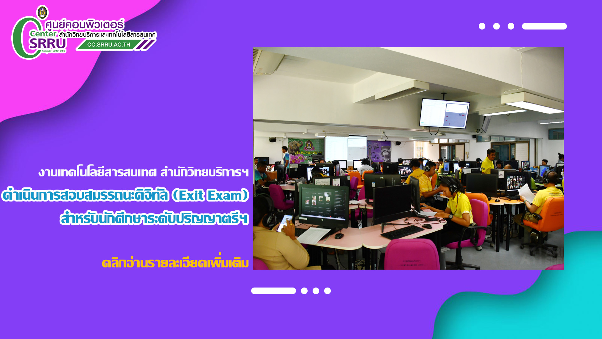 วันที่ 18 มีนาคม 2567 งานเทคโนโลยีสารสนเทศ สำนักวิทยบริการและเทคโนโลยีสารสนเทศ ดำเนินการสอบสมรรถนะดิจิทัล (Exit Exam) สำหรับนักศึกษาระดับปริญญาตรี ภาคปกติ ภาคพิเศษ (กศ.บป) รหัส 64 ทุกหลักสูตร และนักศึกษาที่แจ้งสำเร็จการศึกษา ผ่านระบบ e-testing โดยมีผู้เข้าสอบ จำนวน 1,097 คน