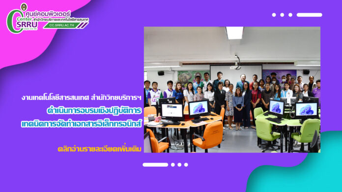 วันที่ 9 พฤษภาคม 2567 งานเทคโนโลยีสารสนเทศ สำนักวิทยบริการและเทคโนโลยีสารสนเทศ ดำเนินการอบรมเชิงปฏิบัติการ เทคนิคการจัดทำเอกสารอิเล็กทรอนิกส์ ณ ห้องปฏิบัติการคอมพิวเตอร์ 28203 ชั้น 2 อาคาร 28 เพื่อเผยแพร่แนวปฏิบัติในการจัดทำเอกสารอิเล็กทรอนิกส์เสนอผู้บริหารลงนามให้เป็นไปอย่างสะดวก รวดเร็ว ปลอดภัย และมีประสิทธิภาพ โดยผู้ช่วยศาสตราจารย์ ดร.อำนวย วัฒนกรสิริ รองอธิการบดีฝ่ายเทคโนโลยีและการสื่อสารองค์กร เป็นประธานเปิดการอบรม และมีหัวหน้าสำนักงาน เลขานุการ เจ้าหน้าที่บริหารงานทั่วไป นักวิชาการคอมพิวเตอร์ และบุคลากรที่มีส่วนเกี่ยวข้องในการจัดทำเอกสารอิเล็กทรอนิกส์เข้าอบรมทั้งสิ้น 35 คน