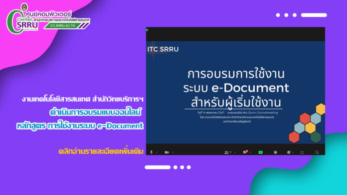 วันที่ 14 พฤษภาคม 2567 งานเทคโนโลยีสารสนเทศ สำนักวิทยบริการและเทคโนโลยีสารสนเทศ ดำเนินการอบรมแบบออนไลน์ หลักสูตร การใช้งานระบบ e-Document ภายใต้โครงการอบรมเชิงปฏิบัติการ การลงนานมเอกสารอิเล็กทรอนิกส์ด้วยลายมือชื่อดิจิทัล เพื่อขยายเครือข่ายผู้ใช้งานระบบ e-Document ไปสู่บุคลากรมหาวิทยาลัยราชภัฏสุรินทร์ทุกระดับ โดยผู้ช่วยศาสตราจารย์ ดร.อำนวย วัฒนกรสิริ รองอธิการบดีฝ่ายเทคโนโลยีและการสื่อสารองค์กร เป็นประธานเปิดการอบรม และมีอาจารย์และบุคลากรเข้าอบรมทั้งสิ้น 96 ท่าน
