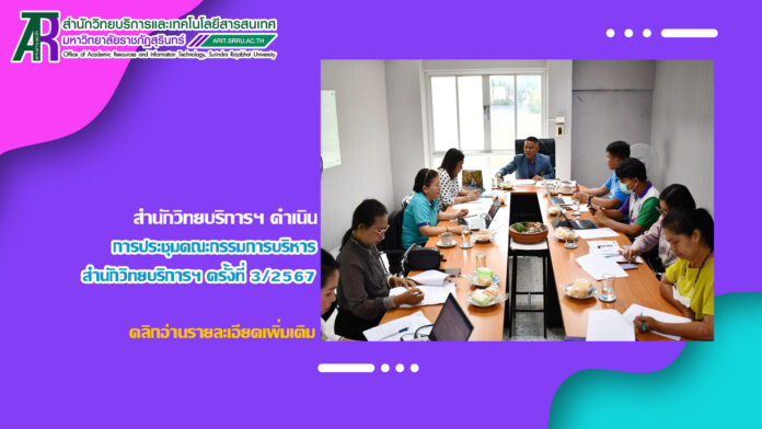 วันที่ 15 พฤษภาคม 2567 เวลา 09.00 น. สำนักวิทยบริการและเทคโนโลยีสารสนเทศ ดำเนินการประชุมคณะกรรมการบริหารสำนักวิทยบริการฯ ครั้งที่ 3/2567 ณ ห้อง Study Room ชั้น 1 อาคารสำนักวิทยบริการฯ โดย ผู้ช่วยศาสตราจารย์สังวาลย์ ตุกพิมาย ผู้อำนวยการสำนักวิทยบริการฯ เป็นประธานการประชุม ในการนี้ ได้มีคณะกรรมการบริหารสำนักวิทยบริการฯ หัวงานฝ่ายต่าง ๆ ของสำนักงานฯ เข้าร่วมประชุม เพื่อพิจารณาตามระเบียบวาระการประชุม