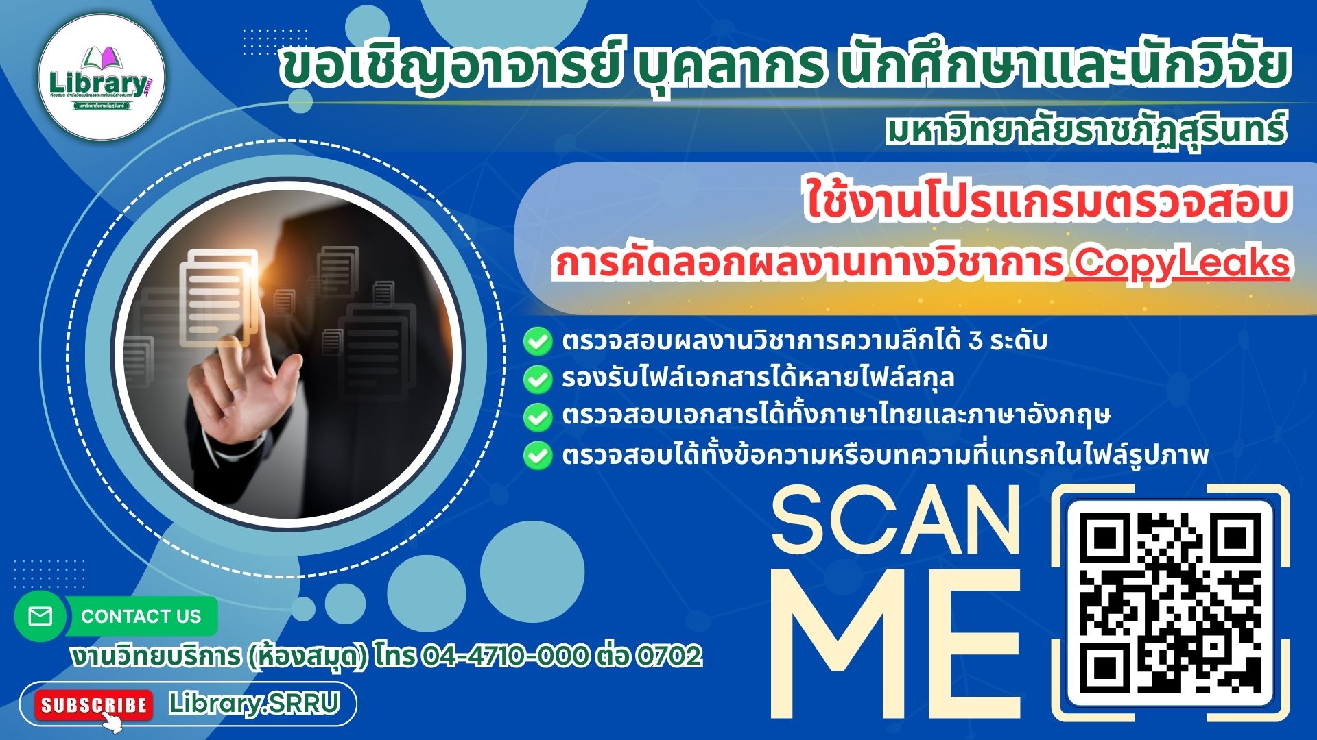 สอบถาม รายละเอียดเพิ่มเตินเพจ Library.SRRU หรือ เพจ Arit.SRRU และสามารถโทร IP PHONE 0701