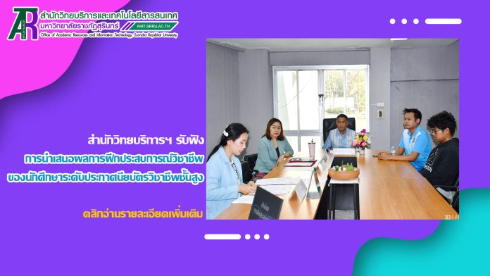 วันที่ 28 กุมภาพันธ์ 2568 เวลา 13.00 น. ผู้ช่วยศาสตราจารย์ ดร.สังวาลย์ ตุกพิมาย ผู้อำนวยการสำนักวิทยบริการและเทคโนโลยีสารสนเทศ ผู้บริหาร และบุคลากรงานเทคโนโลยีสารสนเทศ รับฟังการนำเสนอผลการฝึกประสบการณ์วิชาชีพของนักศึกษา ระดับประกาศนียบัตรวิชาชีพชั้นสูง (ปวส.) สาขาวิชาเทคโนโลยีคอมพิวเตอร์ และสาขาวิชาเครือข่ายคอมพิวเตอร์และความปลอดภัย วิทยาลัยเทคนิคสุรินทร์ จำนวน 7 คน ณ ห้อง Group Study Room ชั้น 1 อาคารสำนักวิทยบริการฯ โดยนักศึกษาเริ่มฝึกประสบการณ์วิชาชีพ ระหว่างวันที่ 15 ตุลาคม 2567 – วันที่ 28 กุมภาพันธ์ 2568