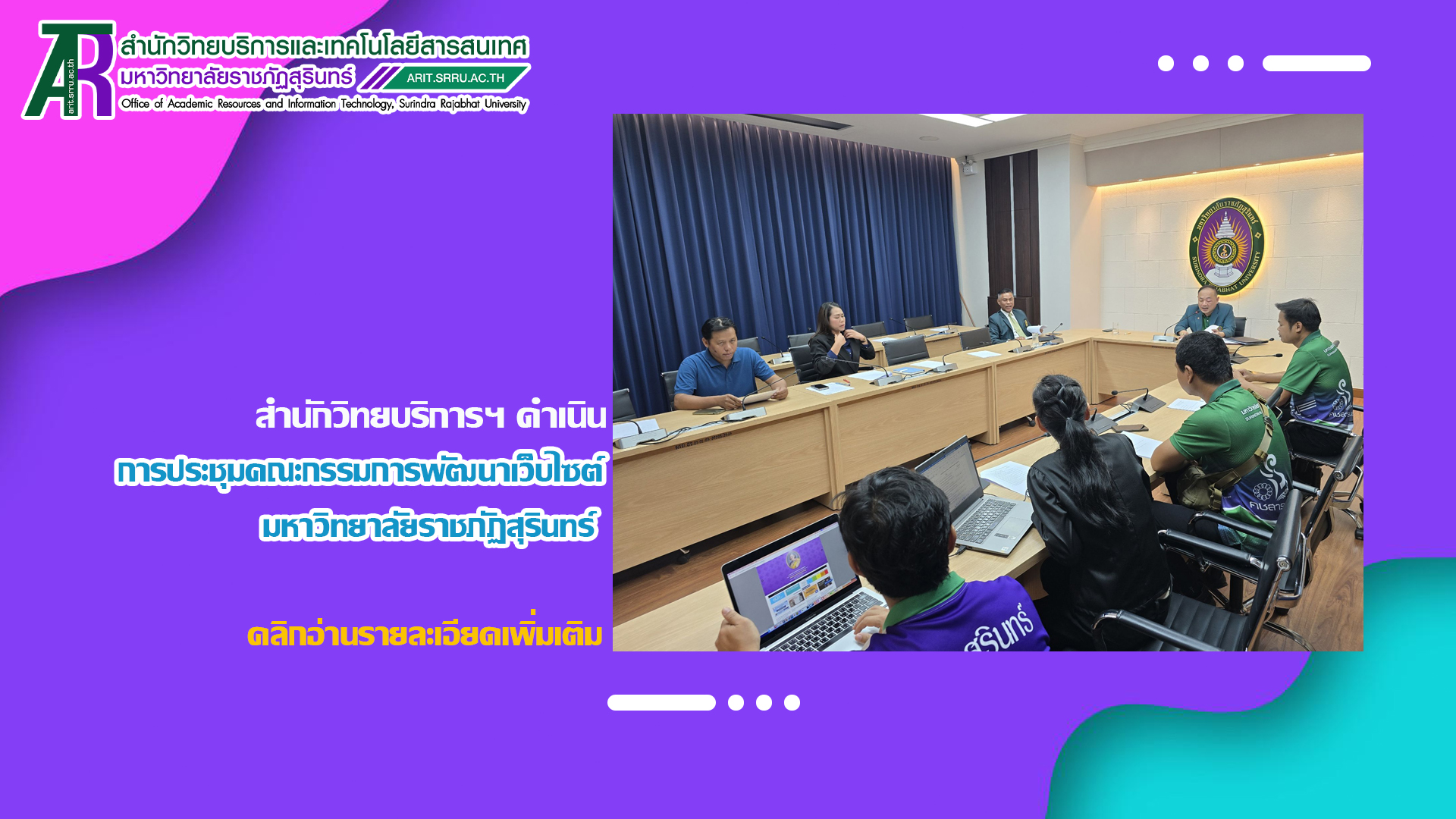 วันที่ 23 เมษายน 2568 เวลา 09.30 น. สำนักวิทยบริการและเทคโนโลยีสารสนเทศ ดำเนินการประชุมคณะกรรมการพัฒนาเว็บไซต์มหาวิทยาลัยราชภัฏสุรินทร์ ณ ห้องคชาธาร ชั้น 2 อาคาร 31 มหาวิทยาลัยราชภัฏสุรินทร์ โดยมี รองศาสตราจารย์ ดร.อำนวย วัฒนกรสิริ รองอธิการบดีเทคโนโลยีและการสื่อสารองค์กร เป็นประธานการประชุม ในการนี้ได้มีคณะกรรมการฯ เข้าร่วมประชุมเพื่อพิจารณากรอบเนื้อหาของการพัฒนาเว็บไซต์มหาวิทยาลัยฯ และพิจารณาในเรื่องอื่นๆ