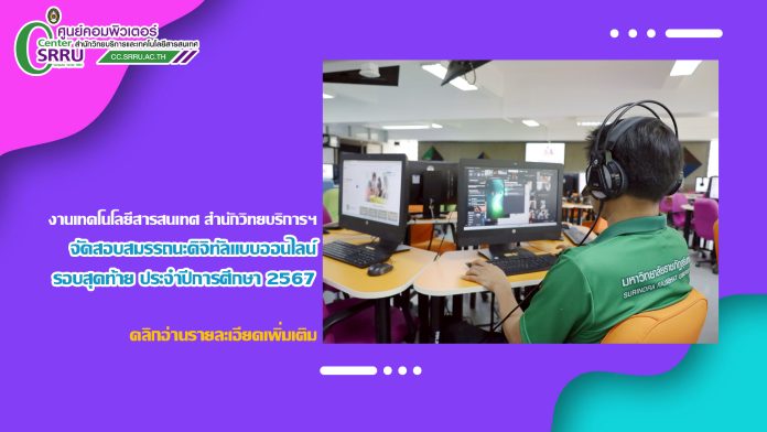 วันที่ 18 มิถุนายน 2568 งานเทคโนโลยีสารสนเทศ สำนักวิทยบริการและเทคโนโลยีสารสนเทศ ดำเนินการจัดสอบสมรรถนะดิจิทัลแบบออนไลน์ รอบสุดท้าย ประจำปีการศึกษา 2567 สำหรับนักศึกษาระดับปริญญาตรีภาคปกติและภาคพิเศษ ผ่านระบบจัดสอบอิเล็กทรอนิกส์ e-testing.srru.ac.th โดยมีนักศึกษาเข้าสอบทั้งสิ้น 153 คน