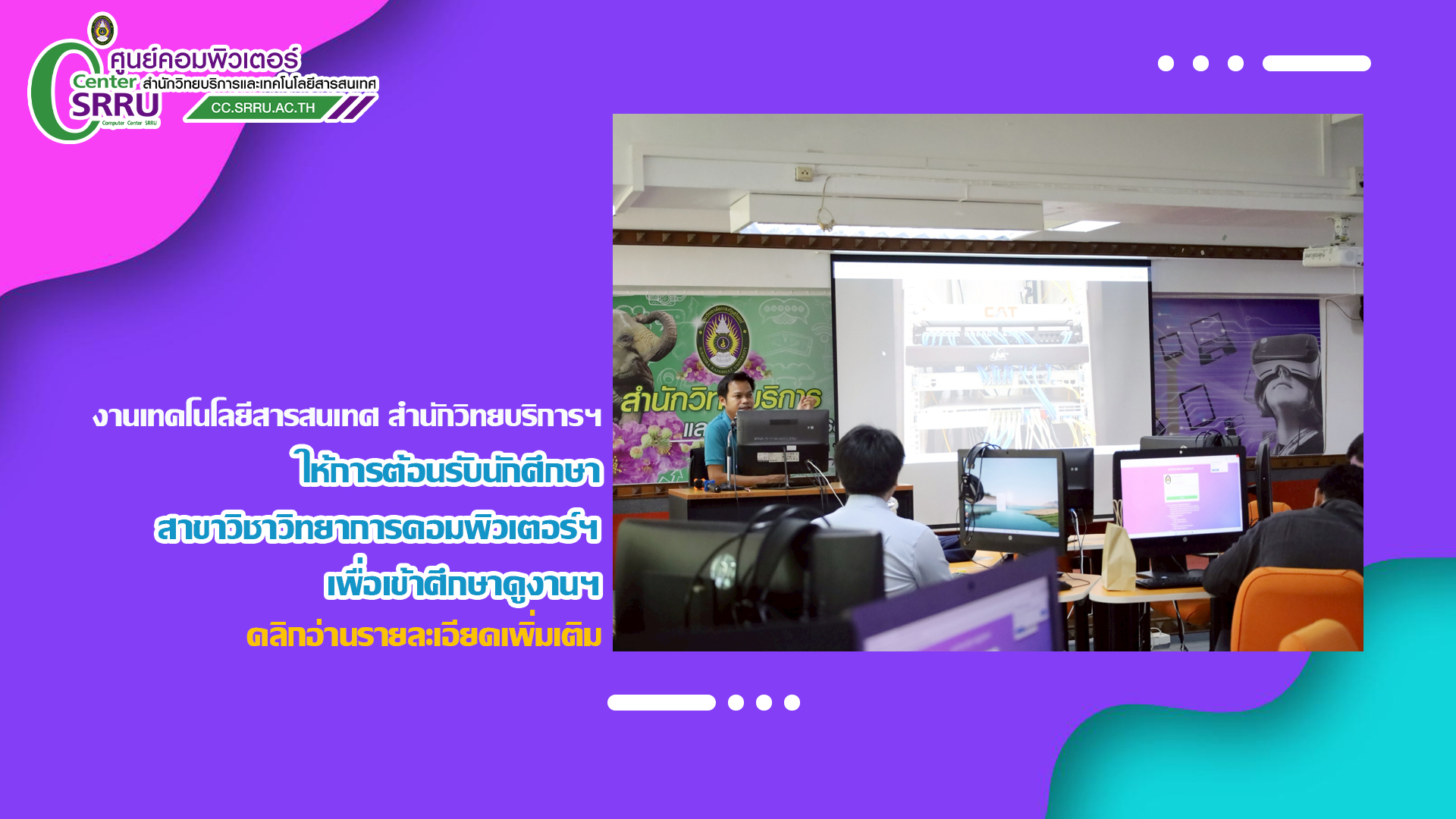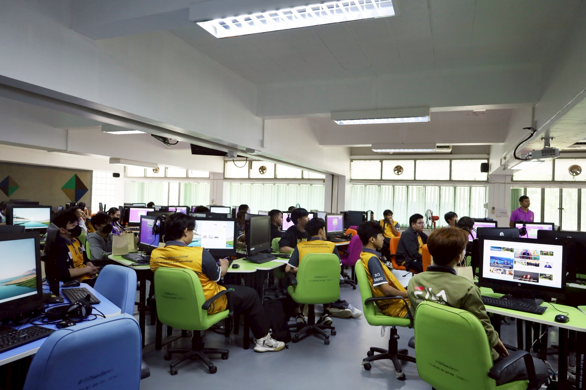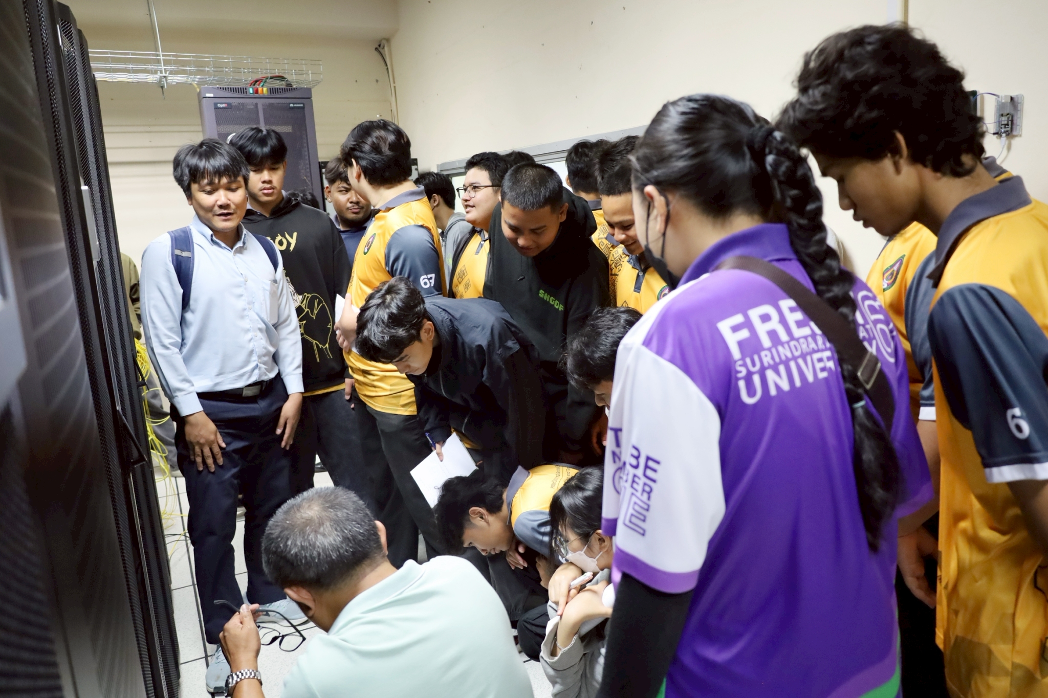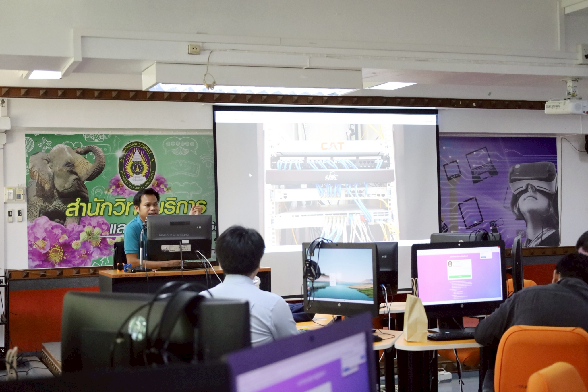 วันที่ 19 มิถุนายน 2568 เวลา 09.30 น. งานเทคโนโลยีสารสนเทศ สำนักวิทยบริการและเทคโนโลยีสารสนเทศ โดยนายสุภาษิต เติมกล้า หัวหน้างานเทคโนโลยีสารสนเทศ และนายโกสิน สนั่นนาม นักวิชาการคอมพิวเตอร์ ให้การต้อนรับนักศึกษาหลักสูตรวิทยาศาสตรบัณฑิต สาขาวิชาวิทยาการคอมพิวเตอร์ คณะวิทยาศาสตร์และเทคโนโลยี ณ ห้องปฏิบัติการคอมพิวเตอร์ ชั้น 2 อาคาร 28 และนำชมห้อง Data Center ชั้น 3 อาคาร 31 เพื่อเปิดโอกาสให้นักศึกษาได้เรียนรู้และเข้าใจการทำงานด้านระบบเครือข่ายคอมพิวเตอร์ โดยกิจกรรมนี้เป็นส่วนหนึ่งของการเรียนการสอนรายวิชาเครือข่ายคอมพิวเตอร์และการสื่อสารข้อมูล ประจำภาคเรียนที่ 1/2568 โดย ผู้ช่วยศาสตราจารย์ ดร.ธงชัย เจือจันทร์ อาจารย์ประจำรายวิชา
