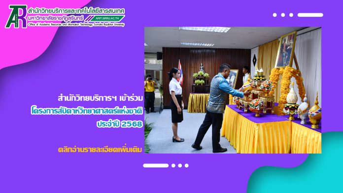 วันที่ 15 สิงหาคม 2568 เวลา 09.30 น. สำนักวิทยบริการและเทคโนโลยีสารสนเทศ โดย ผู้ช่วยศาสตราจารย์ ดร.สังวาลย์ ตุกพิมาย ผู้อำนวยการสำนักวิทยบริการฯ เข้าร่วมโครงการสัปดาห์วิทยาศาสตร์แห่งชาติ ประจำปี 2568 ณ ห้องประชุม 29101 ชั้น 1 อาคาร 29 คณะวิทยาศาสตร์และเทคโนโลยี ซึ่งมีกิจกรรมพิธีวางพานพุ่มราชสักการะพระบาทสมเด็จพระจอมเกล้าเจ้าอยู่หัว รัชกาลที่ 4 และพิธีมอบเกียรติบัตรเชิดชูเกียรติอาจารย์ผู้มีผลงานทางวิชาการ นักวิจัยดีเด่น อาจารย์ผู้สอนดีเด่น และผู้ปฏิบัติงานดีเด่น