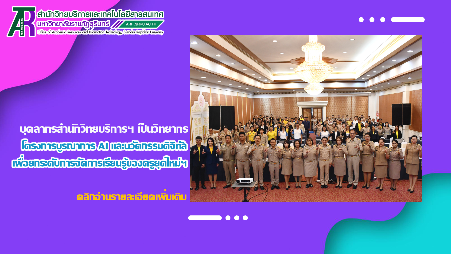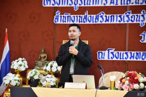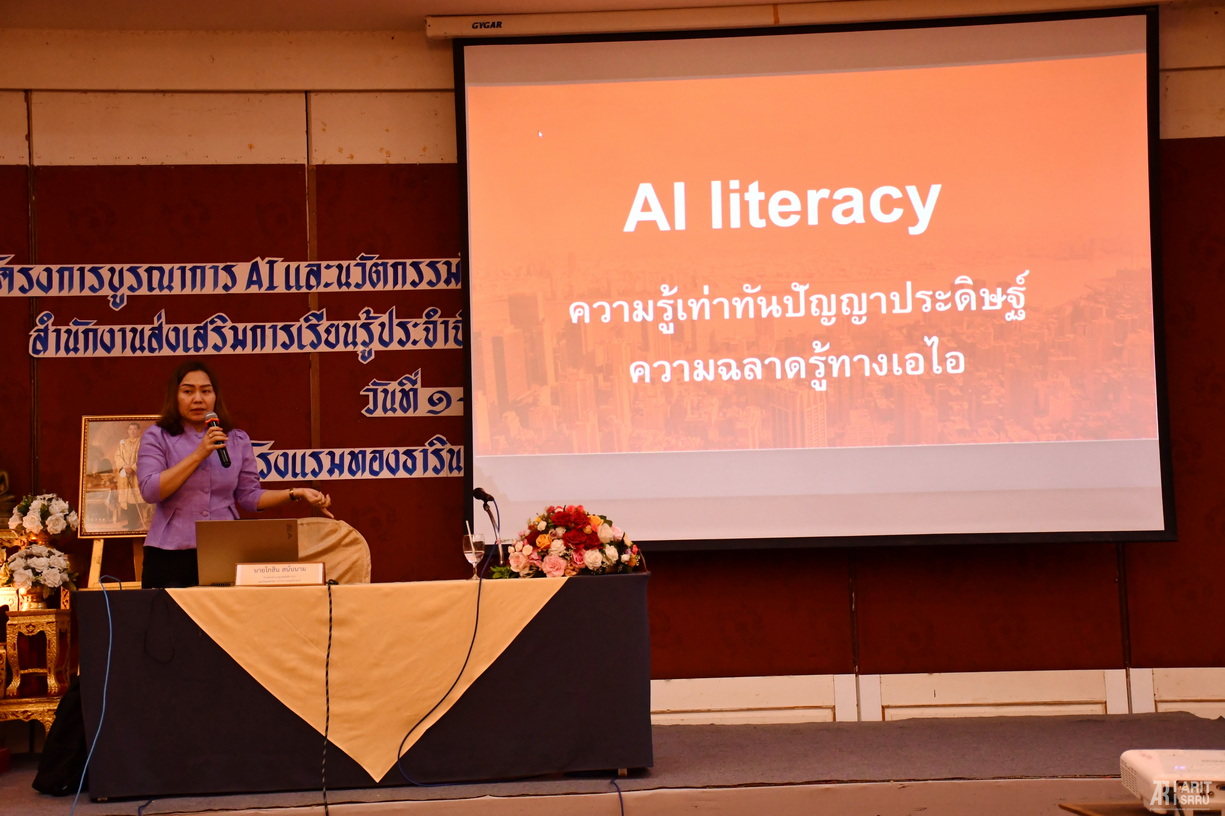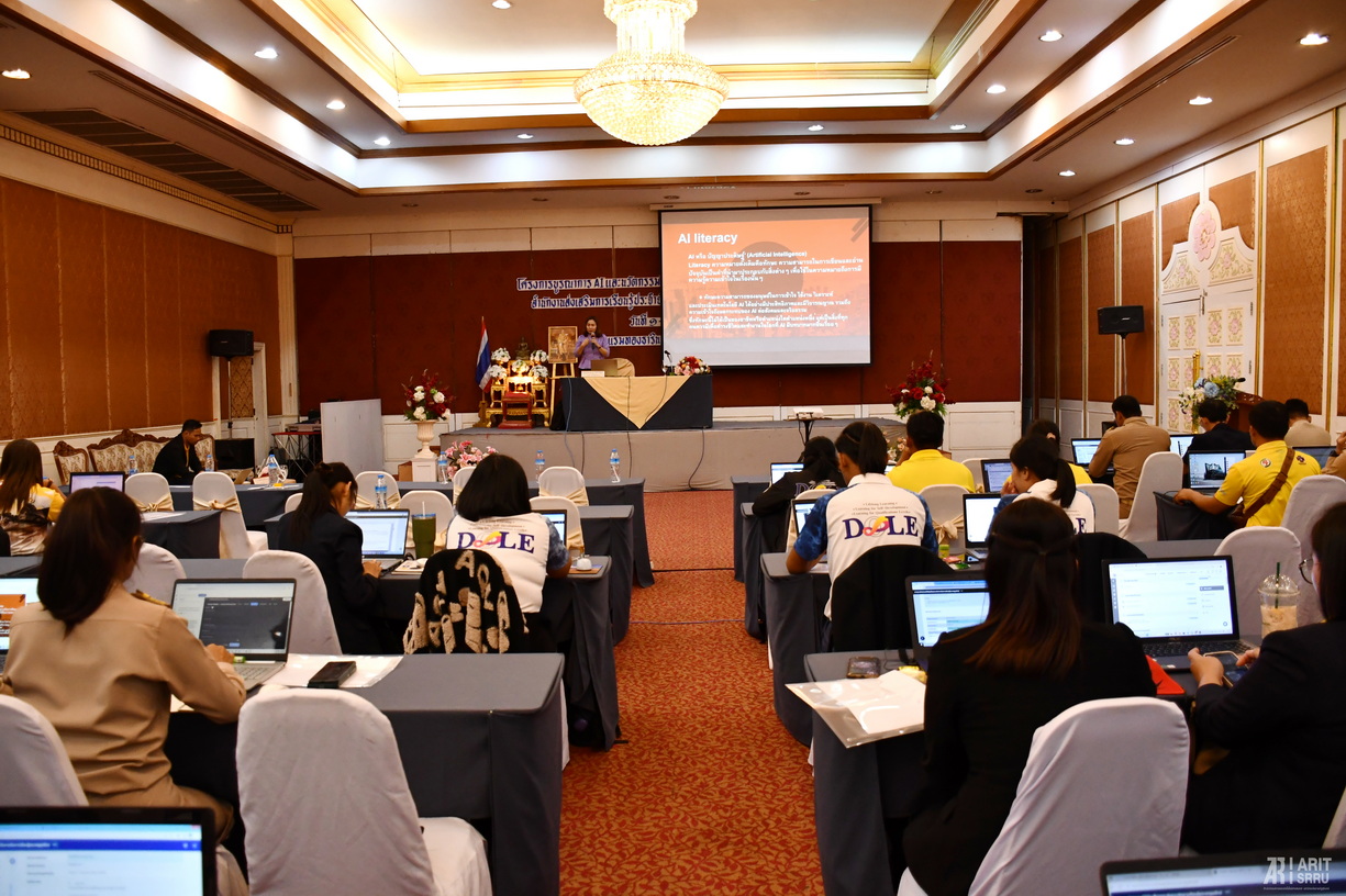 วันที่ 4 กันยายน 2568 บุคลากรสำนักวิทยบริการและเทคโนโลยีสารสนเทศ นำโดย อาจารย์สุภาสินี วิเชียร รองผู้อำนวยการสำนักวิทยบริการฯ ฝ่ายวิทยบริการ และบุคลากรงานเทคโนโลยีสารสนเทศ เป็นวิทยากรให้ความรู้ ในโครงการบูรณาการ AI และนวัตกรรมดิจิทัลเพื่อยกระดับการจัดการเรียนรู้ของครูยุคใหม่ สำนักงานส่งเสริมการเรียนรู้ประจำจังหวัดสุรินทร์ ประจำปีงบประมาณ พ.ศ. 2568 ระหว่างวันที่ 1 – 4 กันยายน 2568 ณ โรงแรมทองธารินทร์ อำเภอเมือง จังหวัดสุรินทร์ โดยมีบุคลากรสำนักงานส่งเสริมการเรียนรู้ประจำจังหวัดสุรินทร์ เข้าร่วมอบรม จำนวน 80 คน