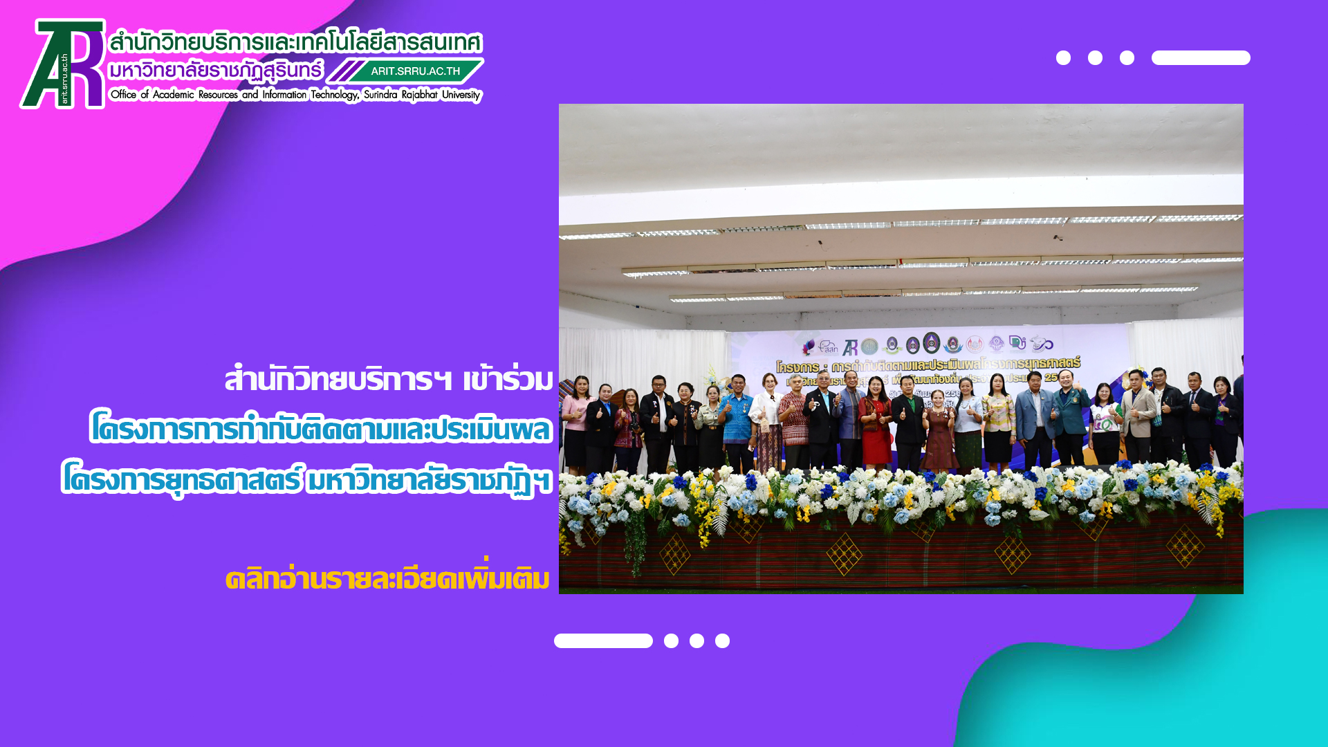 วันที่ 5 กันยายน 2568 เวลา 09.00 น. สำนักวิทยบริการและเทคโนโลยีสารสนเทศ โดย ผู้ช่วยศาสตราจารย์ ดร.สังวาลย์ ตุกพิมาย ผู้อำนวยการสำนักวิทยบริการฯ นำบุคลากรสำนักวิทยบริการ เข้าร่วมโครงการการกำกับติดตามและประเมินผลโครงการยุทธศาสตร์ มหาวิทยาลัยราชภัฏสุรินทร์ เพื่อพัฒนาท้องถิ่น ประจำปีงบประมาณ 2568 ณ หอประชุม มหาวิทยาลัยราชภัฏสุรินทร์