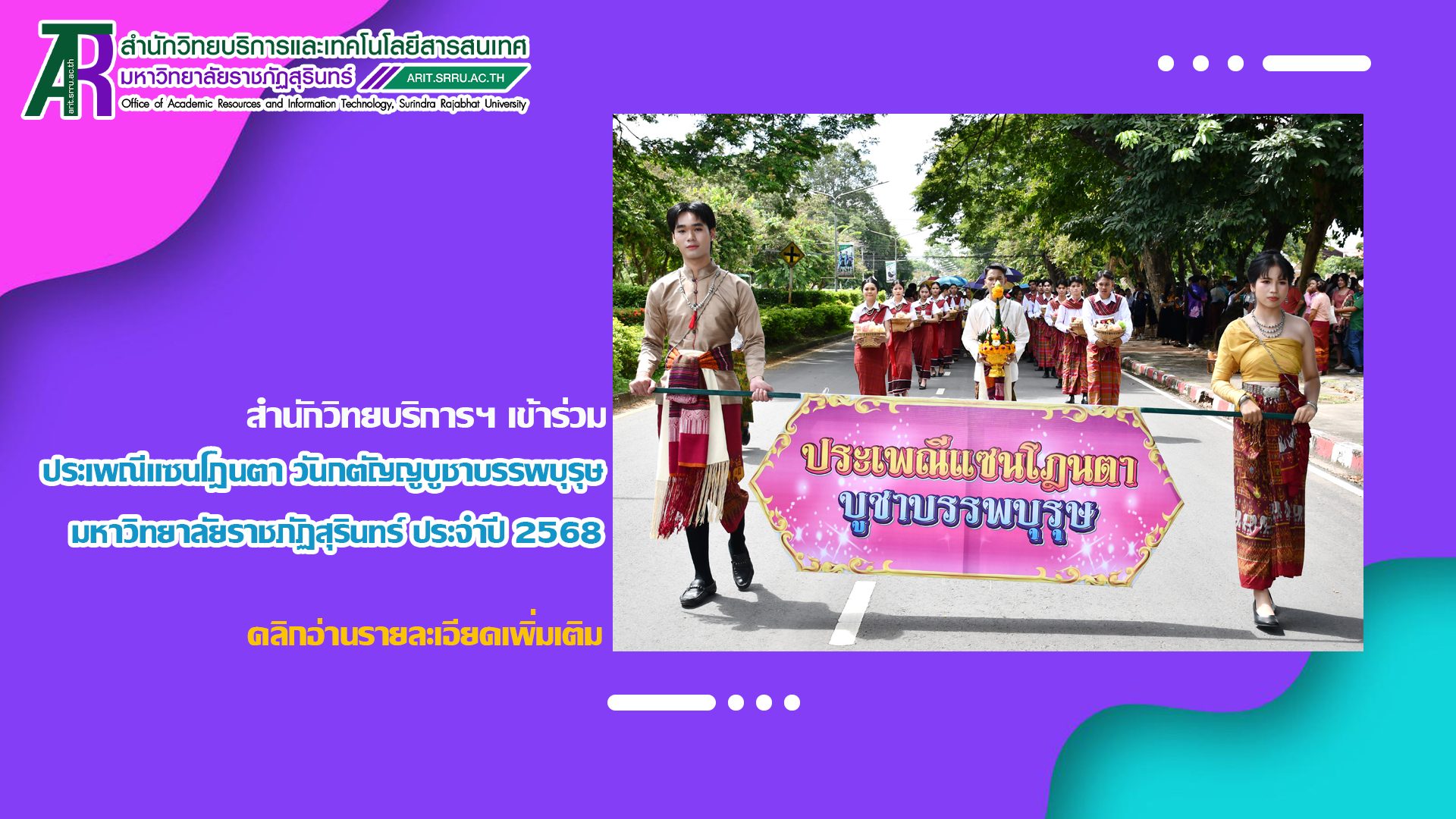 วันที่ 18 กันยายน 2568 เวลา 13.00 น. สำนักวิทยบริการและเทคโนโลยีสารสนเทศ โดย ผู้ช่วยศาสตราจารย์ ดร.สังวาลย์ ตุกพิมาย ผู้อำนวยการสำนักวิทยบริการฯ พร้อมด้วยผู้บริหาร และบุคลากรสำนักวิทยบริการฯ เข้าร่วม ประเพณีแซนโฎนตา วันกตัญญูบูชาบรรพบุรุษ มหาวิทยาลัยราชภัฏสุรินทร์ ประจำปี 2568 ณ ศาลตายาย มหาวิทยาลัยราชภัฏสุรินทร์