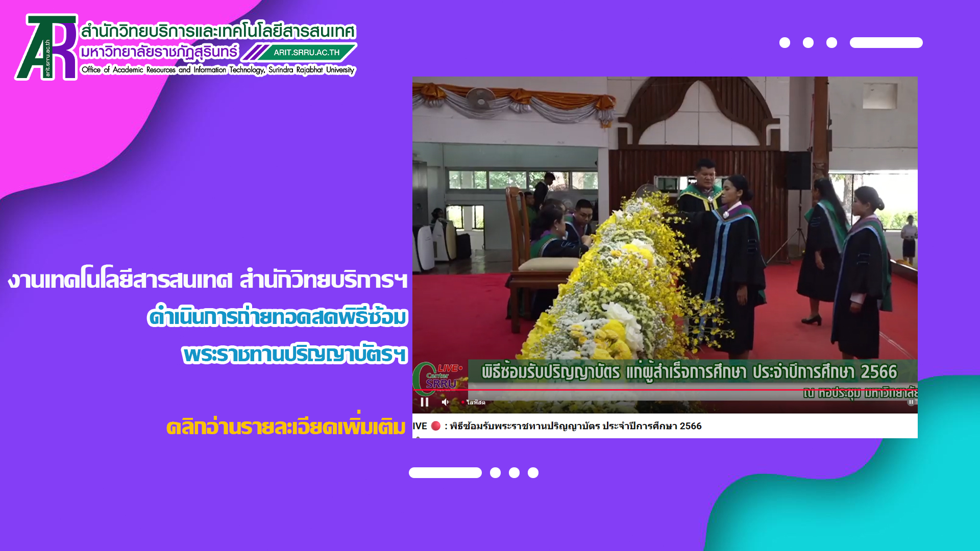 Slideข่าวประชาสัมพันธ์ภาพกิจกรรม งานเทคโนโลยีสารสนเทศ สำนักวิทยบริการฯ ดำเนินการถ่ายทอดสดพิธีซ้อมพระราชทานปริญญาบัตร บัณฑิต มหาบัณฑิต ดุษฎีบัณฑิต มหาวิทยาลัยราชภัฏสุรินทร์ ประจำปีการศึกษา 2566 ตุลาคม 8, 2025 142 วันที่ 8 ตุลาคม 2568 เวลา 10.00 น. งานเทคโนโลยีสารสนเทศ สำนักวิทยบริการและเทคโนโลยีสารสนเทศ ดำเนินการถ่ายทอดสดพิธีซ้อมพระราชทานปริญญาบัตร บัณฑิต มหาบัณฑิต ดุษฎีบัณฑิต มหาวิทยาลัยราชภัฏสุรินทร์ ประจำปีการศึกษา 2566 ณ หอประชุมมหาวิทยาลัยราชภัฏสุรินทร์