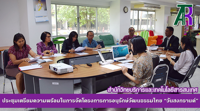 วันที่ 27 มีนาคม 2561 ผู้ช่วยศาสตราจารย์สังวาลย์ ตุกพิมาย รองผู้อำนวยการสำนักวิทยบริการและเทคโนโลยีสารสนเทศ ฝ่ายวิทยบริการ เป็นประธานในการประชุมเตรียมความพร้อมในการจัดโครงการการอนุรักษ์วัฒนธรรมไทย “วันสงกรานต์” ครั้งที่ 1/2561 โดยมี ดร.สมเกียรติ เพ็ชรมาก รองผู้อำนวยการสำนักวิทยบริการและเทคโนโลยีสารสนเทศ ฝ่ายเทคโนโลยีสารสนเทศและบุคลากรที่เกี่ยวข้องเข้าร่วมประชุมอย่างพร้อมเพรียงกัน