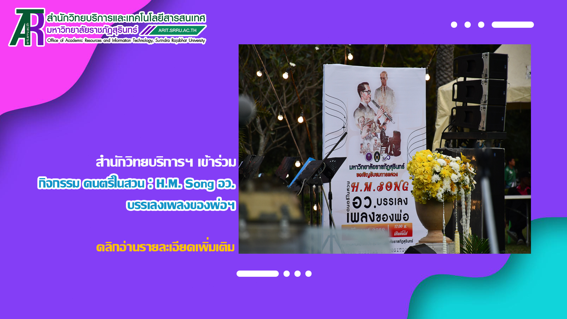 วันที่ 4 ธันวามคม 2568 เวลา 18.00 น. สำนักวิทยบริการและเทคโนโลยีสารสนเทศ โดย ผู้ช่วยศาสตราจารย์ ดร.กฤช ตรองจิตต์ ผู้อำนวยการสำนักวิทยบริการฯ นำบุคลากรสำนักวิทยบริการฯ เข้าร่วมกิจกรรม “ดนตรีในสวน : H.M. Song อว.บรรเลงเพลงของพ่อ” เพื่อน้อมรำลึกในพระมหากรุณาธิคุณและเทิดพระเกียรติเนื่องในวันคล้ายวันพระบรมราชสมภพ พระบาทสมเด็จพระบรมชนกาธิเบศร มหาอดุลยเดชมหาราช บรมนาถบพิตร 5 ธันวาคม 2568 ณ สนามหน้าหอประชุมมหาวิทยาลัยราชภัฏสุรินทร์