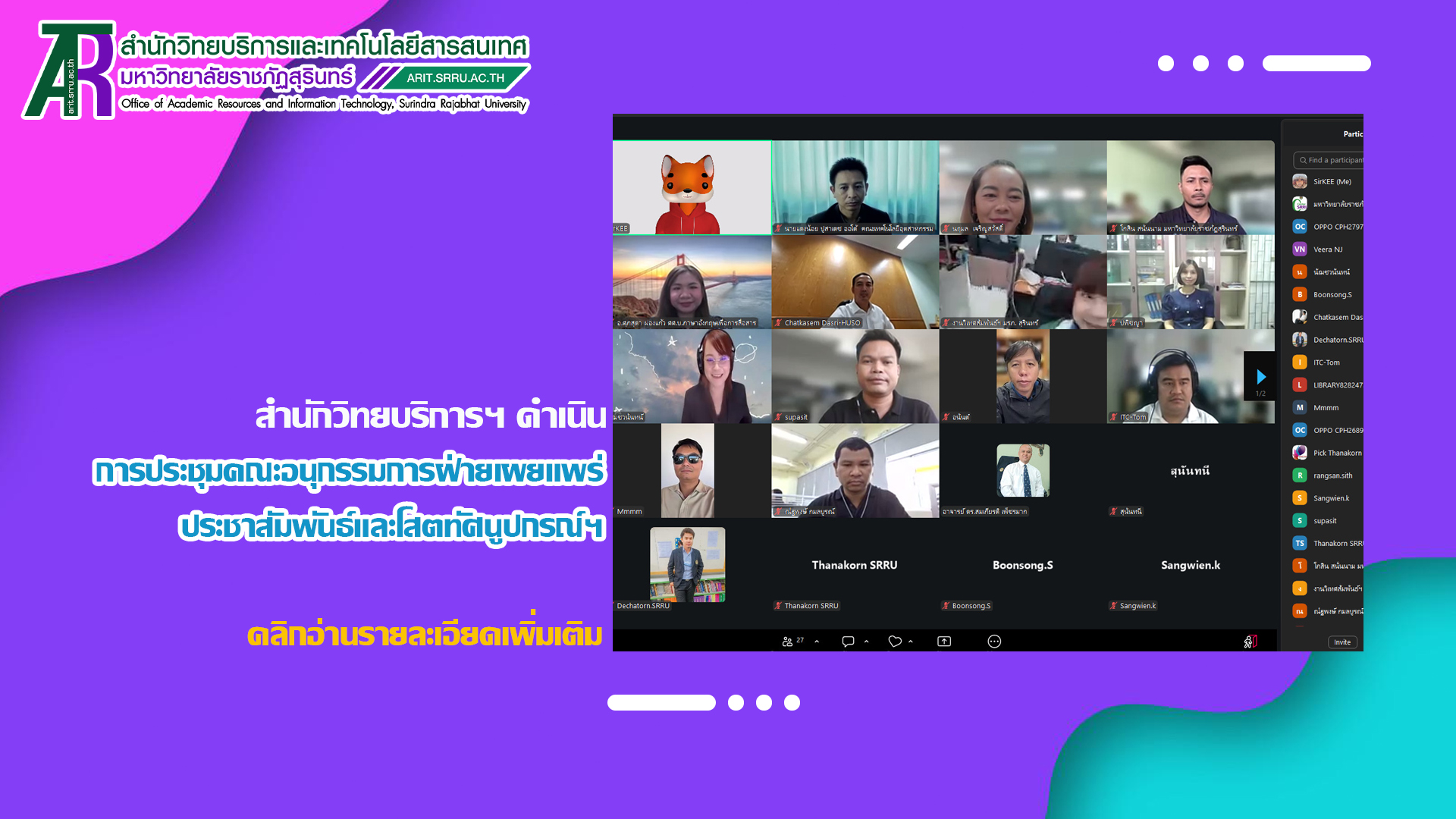 วันที่ 23 มกราคม 2569 เวลา 09.00 น. อาจารย์ ดร.สมเกียรติ เพ็ชรมาก ผู้อำนวยการสำนักวิทยบริการและเทคโนโลยีสารสนเทศ เป็นประธานการประชุมคณะอนุกรรมการฝ่ายเผยแพร่ประชาสัมพันธ์และโสตทัศนูปกรณ์ ฝ่ายปฐมนิเทศนักแสดงต่างชาติและจัดงานแถลงข่าว และฝ่ายจัดแสดงเชื่อมสัมพันธ์นานาชาติ ผ่านระบบประชุมออนไลน์ โดยมีคณะอนุกรรมการทุกฝ่ายเข้าร่วมประชุมเพื่อเตรียมความพร้อมและประสานความร่วมมือ ระหว่างฝ่ายต่าง ๆ ให้การดำเนินกิจกรรมภายใต้เทศกาลการแลกเปลี่ยนวัฒนธรรมนานาชาติ ประจำประเทศไทย ครั้งที่ 4 เป็นไปอย่างเรียบร้อยและมีประสิทธิภาพ ทั้งนี้ งานดังกล่าวมีกำหนดจัดขึ้นระหว่างวันที่ 2 – 8 กุมภาพันธ์ 2569 ณ เวทีสวนสาธารณะเฉลิมพระเกียรติฯ 80 พรรษา (สวนใหม่) และมหาวิทยาลัยราชภัฏสุรินทร์