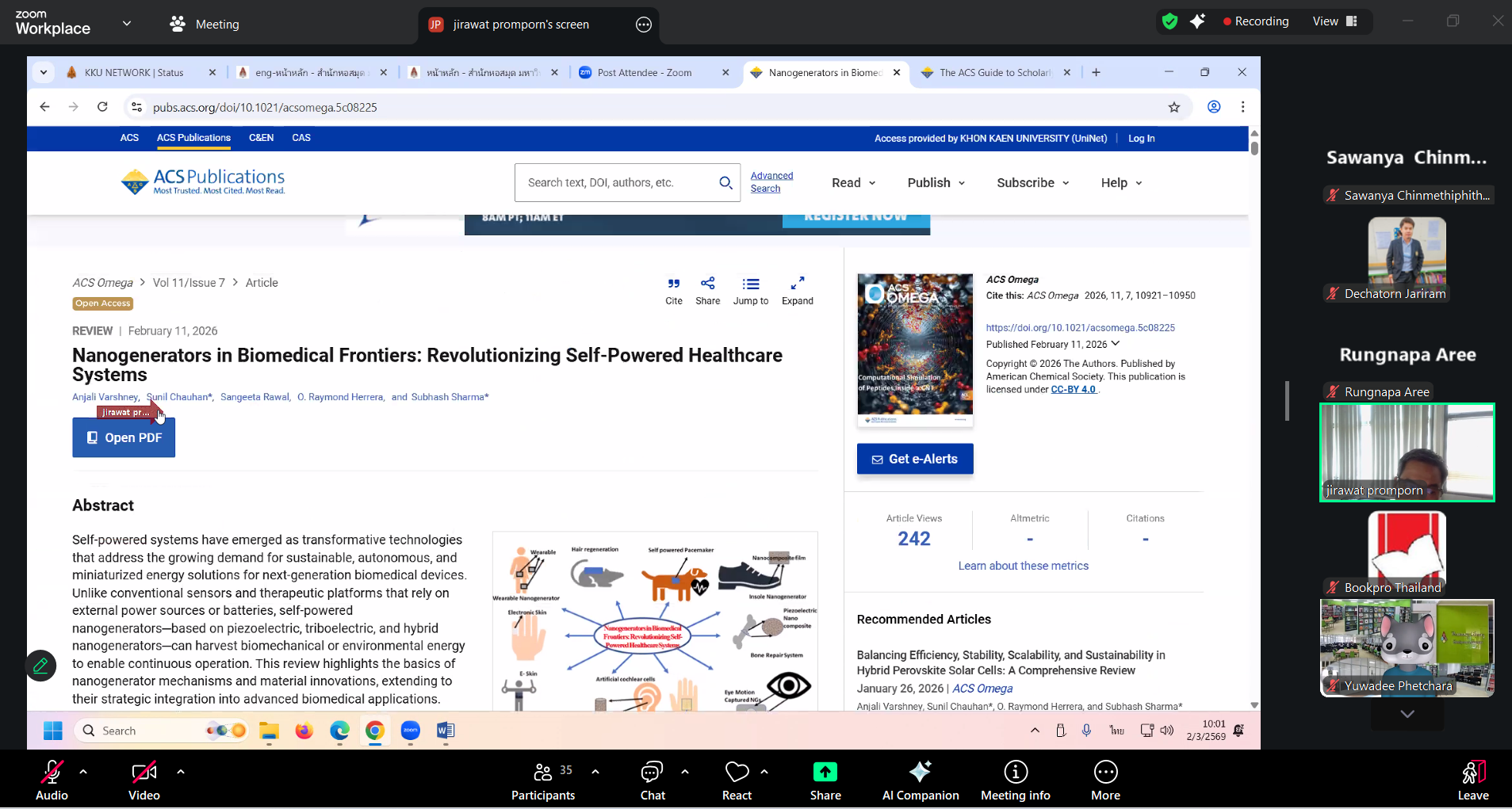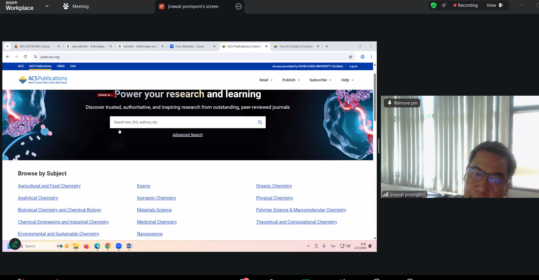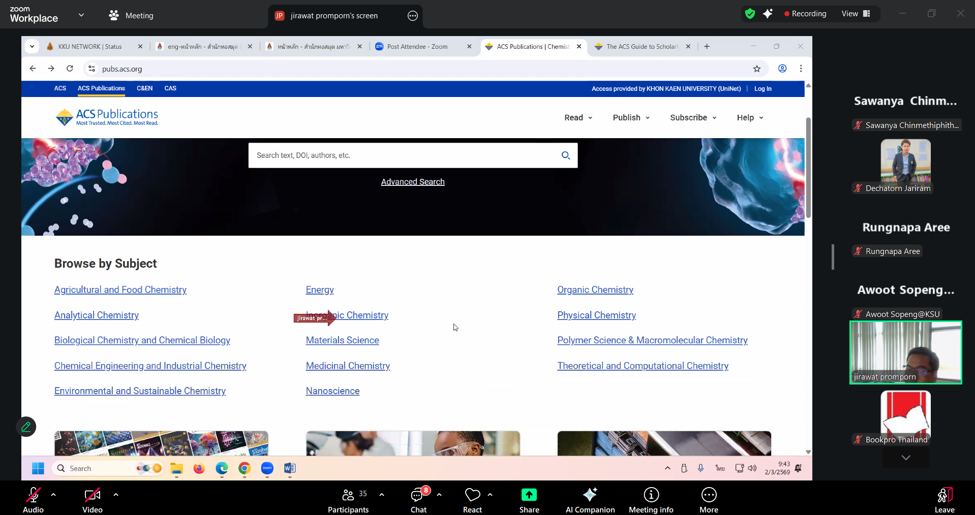 วันที่ 2 มีนาคม 2569 งานวิทยบริการ สำนักวิทยบริการและเทคโนโลยีสารสนเทศ โดย นางสาวลัทธวรรณ แพงเจริญ หัวหน้างานวิทยบริการ นางพัชรี จุลหงษ์ ตำแหน่งบรรณารักษ์ นายเดชาธร จะริรัมย์ ตำแหน่งบรรณารักษ์ และนางสาวอภิญญา เค้ากล้า ตำแหน่งบรรณารักษ์ เข้าร่วมการฝึกอบรมการใช้งานฐานข้อมูลอิเล็กทรอนิกส์เพื่อ การสืบค้นข้อมูล (ออนไลน์) ประจำปี 2569 สำนักงานปลัดประทรวงการอุดมศึกษา วิทยาศาสตร์ วิจัยและนวัตกรรม ผ่านออนไลน์ด้วยโปรแกรม Zoom Meeting โดยมี คุณจิรวัฒน์ พรหมพร บริษัท บุ๊ค โปรโมชั่น แอนด์ เซอร์วิส จำกัด เป็นวิทยากรให้ความรู้ จำนวน 2 ฐานข้อมูล ได้แก่ (1) ฐานข้อมูล American Chemical Society Journal (ACS) (2) Springer Nature Link