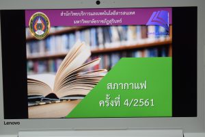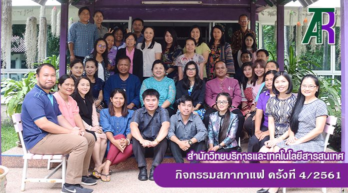 วันที่ 3 พฤษภาคม 2561 สำนักวิทยบริการและเทคโนโลยีสารสนเทศ ได้จัดกิจกรรมสภากาแฟ ครั้งที่ 4/2561 เพื่อเปิดโอกาสให้ผู้บริหารและบุคลากร ได้พบปะ พูดคุยและแลกเปลี่ยนความคิดเห็นเกี่ยวกับแนวทางการปฏิบัติงานซึ่งกันและกัน ในโอกาสนี้เป็นการเลี้ยงส่ง ดร.กาญจนา ไตรรัตน์ บุคลากรสำนักวิทยบริการฯ ได้ย้ายไปปฏิบัติงานในสำนักงานอธิการบดี โดยมี ผู้ช่วยศาสตราจารย์ ดร.สันทนา กูลรัตน์ ผู้อำนวยการสำนักวิทยบริการฯ ผู้ช่วยศาสตราจารย์ประทีป แขรัมย์ รองผู้อำนวยการสำนักวิทยบริการฯ ฝ่ายภาษา และดร.สมเกียรติ เพ็ชรมาก รองผู้อำนวยการสำนักวิทยบริการฯ ฝ่ายเทคโนโลยีสารสนเทศ ได้มอบของที่ระลึกให้กับ ดร.กาญจนา ไตรรัตน์ และกิจกรรมสภากาแฟในครั้งนี้บุคลากรสำนักวิทยบริการฯ ได้เข้าร่วมกิจกรรมอย่างพร้อมเพรียงกัน (ฝ่ายวิทยบริการ เป็นเจ้าภาพในการจัดกิจกรรมสภากาแฟ ครั้งที่ 4)