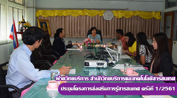 วันที่ 8 สิงหาคม 2561 ผู้ช่วยศาสตราจารย์อัมพาพรรณ พงศ์พลาดิสัย รองอธิการบดี ฝ่ายวิชาการ เป็นประธานในการประชุมโครงการส่งเสริมการรู้สารสนเทศ ครั้งที่ 1/2561 โดยมี ผู้ช่วยศาสตราจารย์ ดร.สันทนา กูลรัตน์ ผู้อำนวยการสำนักวิทยบริการและเทคโนโลยีสารสนเทศ ผู้ช่วยศาสตราจารย์สังวาลย์ ตุกพิมาย รองผู้อำนวยการสำนักวิทยบริการฯ ฝ่ายวิทยบริการ อาจารย์ผู้สอนรายวิชาการศึกษาทั่วไปและบุคลากรสำนักวิทยบริการฯ เข้าร่วมประชุมโดยพร้อมเพรียงกัน