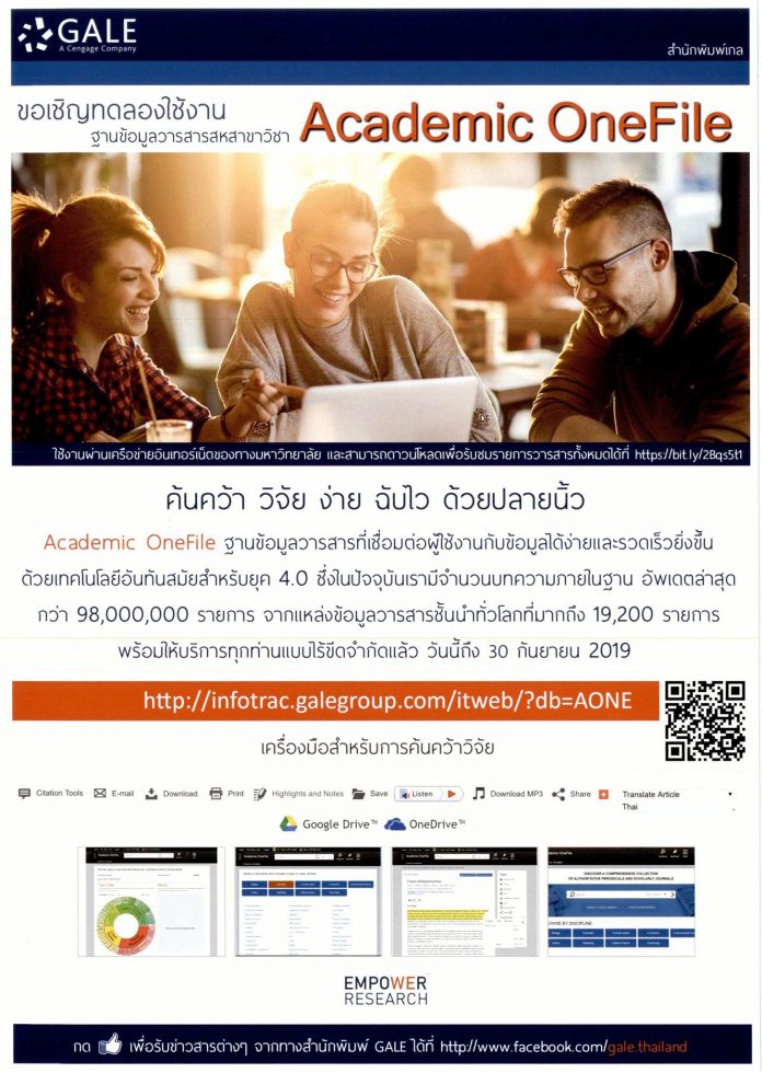 ขอเชิญอาจารย์ นักศึกษา และบุคลากรของมหาวิทยาลัยราชภัฏสุรินทร์ ทดลองใช้ฐานข้อมูล Gale Academic OneFile ได้ตั้งแต่บัดนี้ ถึงวันที่ 30 กันยายน 2562 ซึ่งเป็นฐานข้อมูลที่ประกอบไปด้วยวารสารทั้งหมดกว่า 19,200 รายชื่อ และเป็นวารสารที่ให้ฉบับเต็มมากกว่า 8,000 รายชื่อ ครอบคลุมเนื้อหาทางด้านสังคมศาสตร์ เทคโนโลยี แพทยศาสตร์ วิศวกรรมศาสตร์ ศิลปะ และสาขาอื่นๆ อีกมากมาย สอบถามรายละเอียดเพิ่มเติม โทร. 044-521388-104 หรือ IP Phon 0705 และสามารถใช้งานได้ที่ คลิก