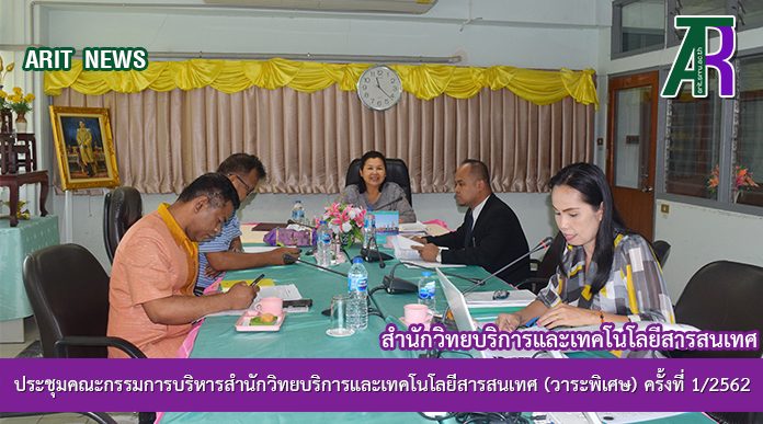 วันที่ 7 มีนาคม 2562 เวลา 11.00 น. สำนักวิทยบริการและเทคโนโลยีสารสนเทศ มหาวิทยาลัยราชภัฏสุรินทร์ จัดประชุมคณะกรรมการบริหารสำนักวิทยบริการและเทคโนโลยีสารสนเทศ (วาระพิเศษ) ครั้งที่ 1/2562 โดยมี ผู้ช่วยศาสตราจารย์ ดร.สันทนา กูลรัตน์ ผู้อำนวยการสำนักวิทยบริการฯ เป็นประธานในการประชุม โดยมี ผู้ช่วยศาสตราจารย์ ดร.ประทีป แขรัมย์ รองผู้อำนวยการสำนักวิทยบริการฯ ฝ่ายภาษา ผู้ช่วยศาสตราจารย์สังวาลย์ ตุกพิมาย รองผู้อำนวยการสำนักวิทยบริการฯ ฝ่ายวิทยบริการและอาจารย์ ดร.สมเกียรติ เพ็ชรมาก รองผู้อำนวยการสำนักวิทยบริการฯ ฝ่ายเทคโนโลยีสารสนเทศเข้าร่วมประชุมอย่างพร้อมเพรียงกัน