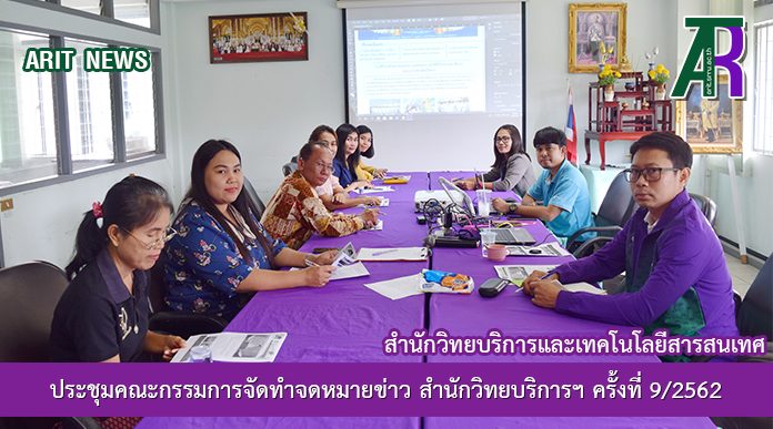 วันที่ 10 กันยายน 2562 เวลา 13.30 น. นายสมโภชน์ ละม้ายวรรณ ตำแหน่งบรรณารักษ์ เป็นประธานในการประชุมคณะกรรมการจัดทำจดหมายข่าว สำนักวิทยบริการฯ ครั้งที่ 9/2562 เพื่อพิจารณา (ร่าง) จดหมายข่าว ฉบับที่ 44 ประจำเดือนสิงหาคม 2562 เพื่อดำเนินการต่อไป โดยมีคณะกรรมการจัดทำจดหมายเข้าร่วมพิจารณา (ร่าง) จดหมายข่าว