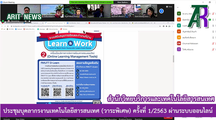 วันที่ 23 ธันวาคม 2563 งานเทคโนโลยีสารสนเทศ จัดประชุมบุคลากรงานเทคโนโลยีสารสนเทศ (วาระพิเศษ) ครั้งที่ 1 ประจำปี 2563 ผ่านระบบออนไลน์ โดยมี อาจารย์ ดร.สมเกียรติ เพ็ชรมาก รองผู้อำนวยการสำนักวิทยบริการและเทคโนโลยีสารสนเทศ ฝ่ายเทคโนโลยีสารสนเทศ เป็นประธานในการประชุม เพื่อพิจารณา ดังนี้ 1.เตรียมการจัดการเรียนการสอนออนไลน์เเละ Work from Home ภาคเรียนที่ 2/2563 2.เตรียมการระบบเทคโนโลยีสารสนเทศ กรณีดับกระเเสไฟฟ้าภายในมหาวิทยาลัย