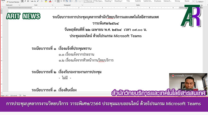 วันที่ 22 เมษายน 2564 เวลา 09.00 น. งานวิทยบริการ สำนักวิทยบริการและเทคโนโลยีสารสนเทศ จัดการประชุมบุคลากรงานวิทยบริการ วาระพิเศษ/2564 ประชุมแบบออนไลน์ ด้วยโปรแกรม Microsoft Teams โดยมี ผู้ช่วยศาสตราจารย์สังวาลย์ ตุกพิมาย รักษาราชการแทน รองผู้อำนวยการสำนักวิทยบริการฯ เป็นประธานการประชุม โดยบุคลากรงานวิทยบริการเข้าร่วมประชุม เพื่อพิจารณาหาแนวทางการให้บริการในช่วงสถานการณ์การแพร่ระบาดของโรคติดเชื้อไวรัสโคโรนา 2019 (COVID-19) และการมอบหมายภาระงานและจัดทำตารางการปฏิบัติงานของบุคลากรงานวิทยบริการ