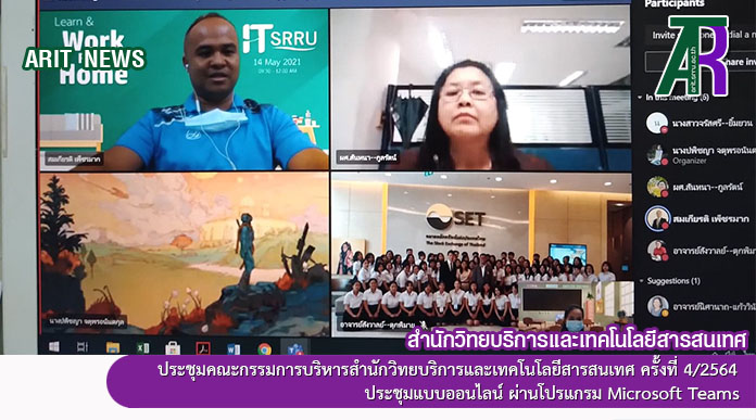 วันที่ 28 พฤษภาคม 2564 เวลา 13.00 น. สำนักวิทยบริการและเทคโนโลยีสารสนเทศ จัดประชุมคณะกรรม การบริหารสำนักวิทยบริการและเทคโนโลยีสารสนเทศ ครั้งที่ 4/2564 ประชุมแบบออนไลน์ ผ่านโปรแกรม Microsoft Teams โดยมี ผู้ช่วยศาสตราจารย์สันทนา กูลรัตน์ ผู้อำนวยการสำนักวิทยบริการฯ เป็นประธาน การประชุม ในการนี้ ได้มีคณะกรรมการบริหารสำนักวิทยบริการฯ เข้าร่วมประชุมเพื่อพิจารณาในวาระต่างๆ